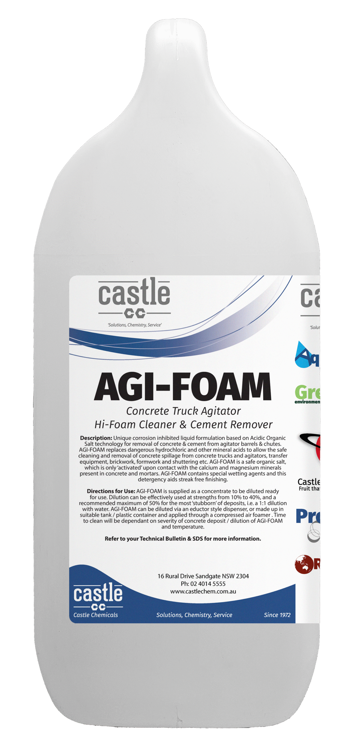 AGI FOAM is a low hazard, foaming concrete remover and cleaner formulated using advanced organic salt technology. It is specifically designed for the effective cleaning of concrete trucks, agitators and associated equipment where controlled foaming action is required.