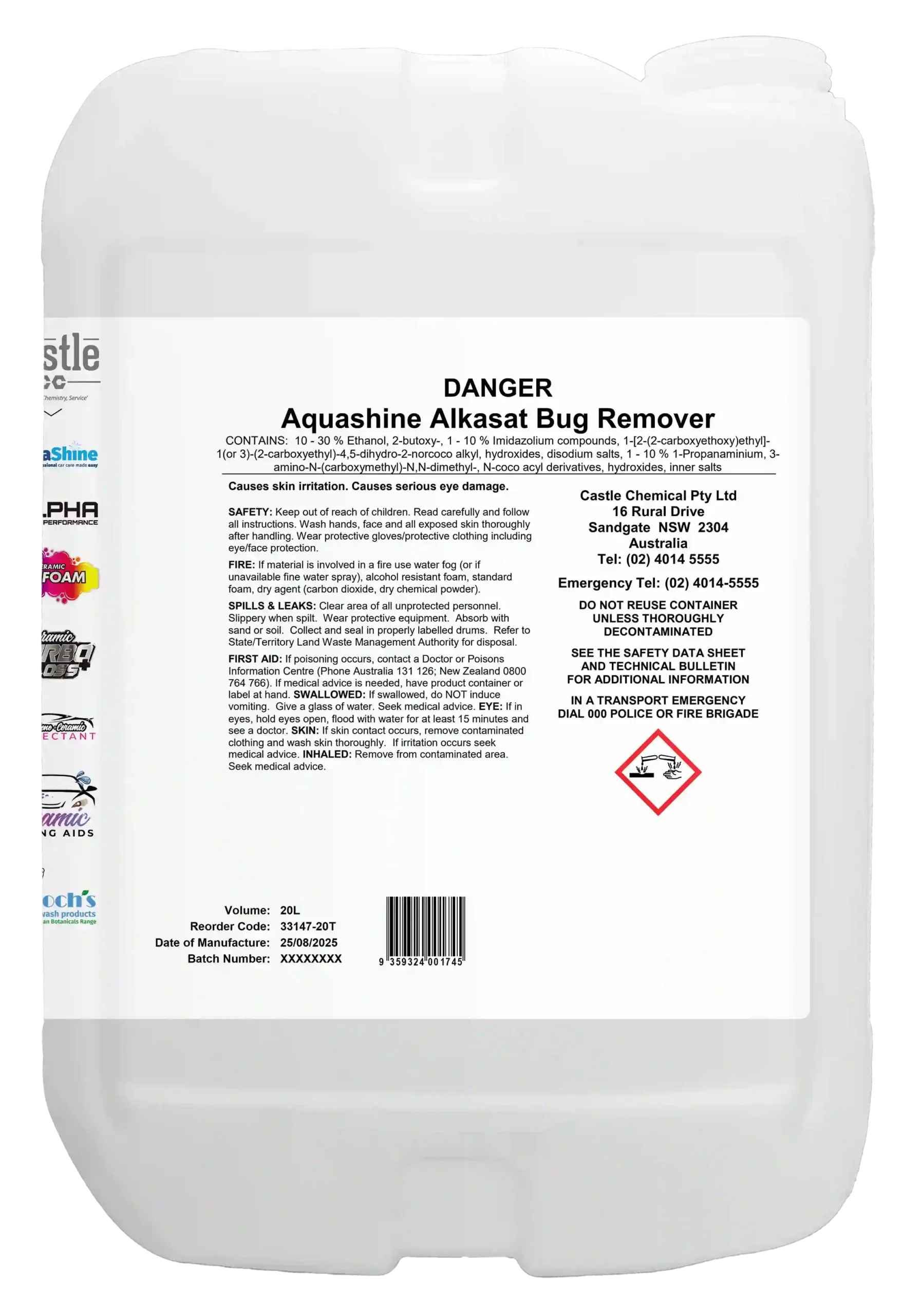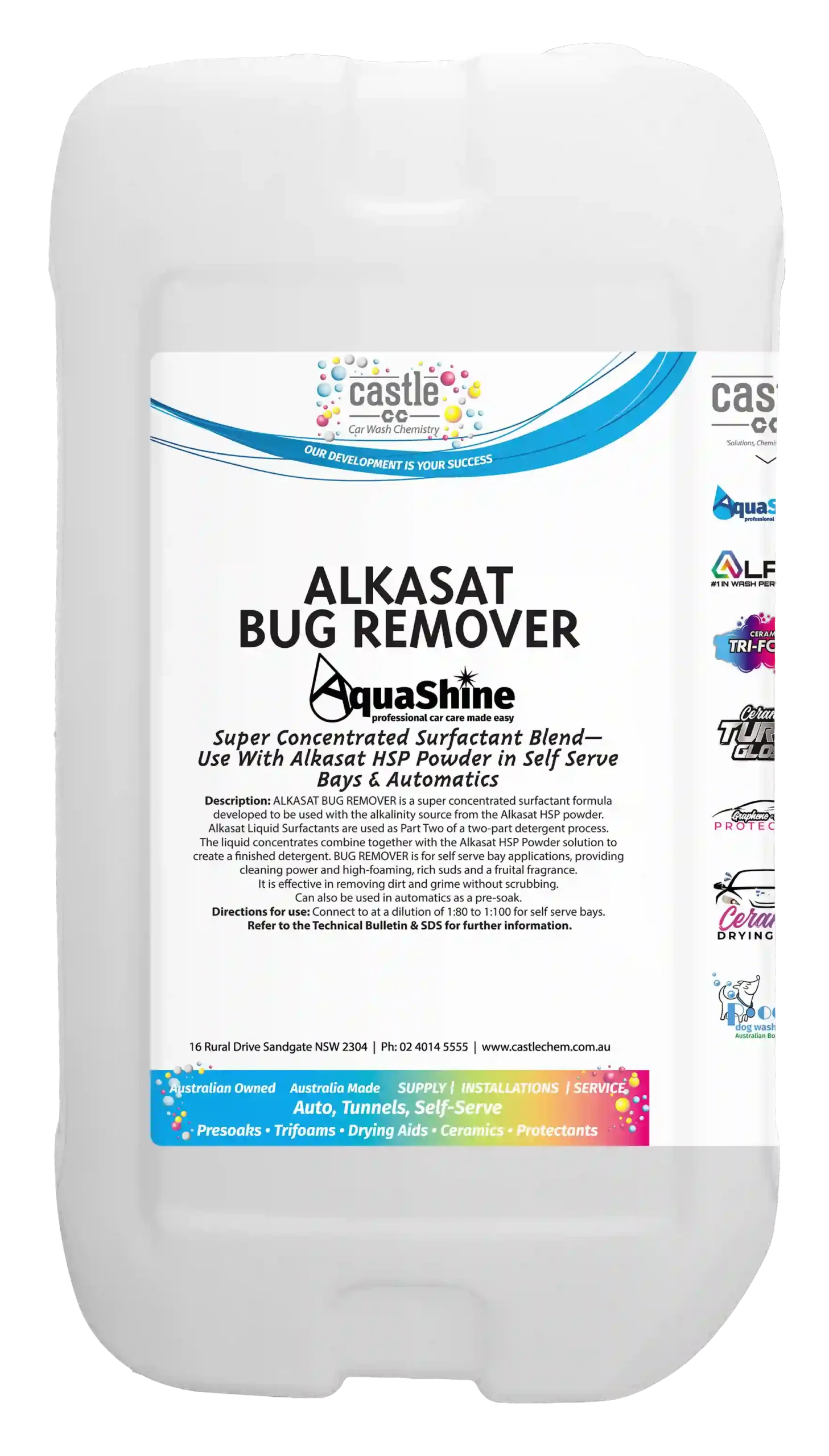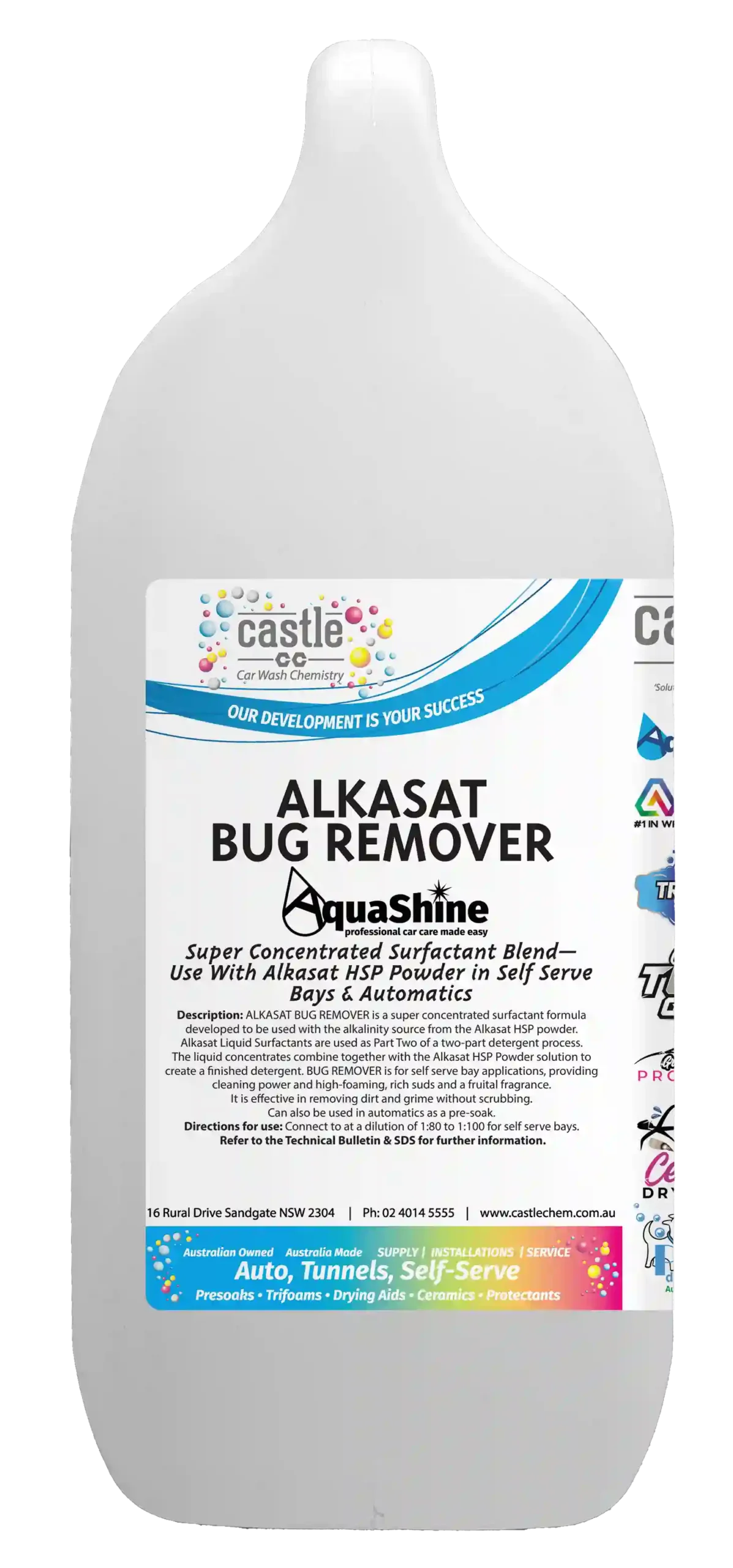 ALKASAT BUG REMOVER when combined with the alkalinity from the ALKASAT HSP solution has been developed for self-serve applications. The highly concentrated formula is optimized for quick penetration of road film and emulsification of oil components on vehicle surfaces.