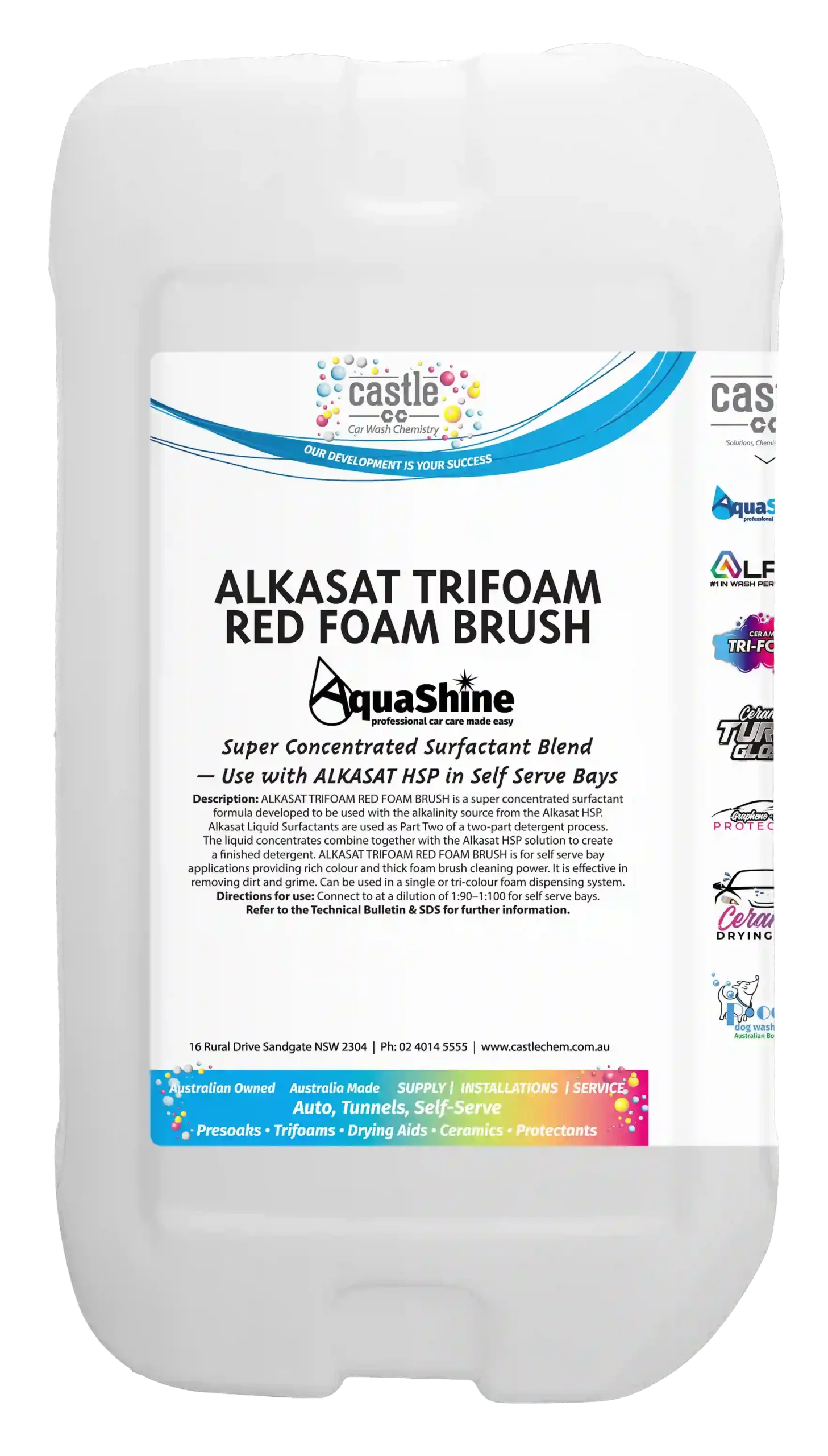 ALKASAT TRIFOAM FOAM BRUSH in blue, yellow and red is a super concentrated surfactant formula developed to be used with the alkalinity source from the Alkasat HSP powder. Alkasat Liquid Surfactants are used as Part Two of a two-part detergent process. The liquid concentrates combine together with the Alkasat HSP Powder solution to create a finished detergent TRIFOAM FOAM BRUSH is for self-serve bay applications providing rich colour & thick foam brush cleaning power. It is effective in removing dirt and grime through the foam brush. Can be used in a single or tri-colour foam dispensing system.