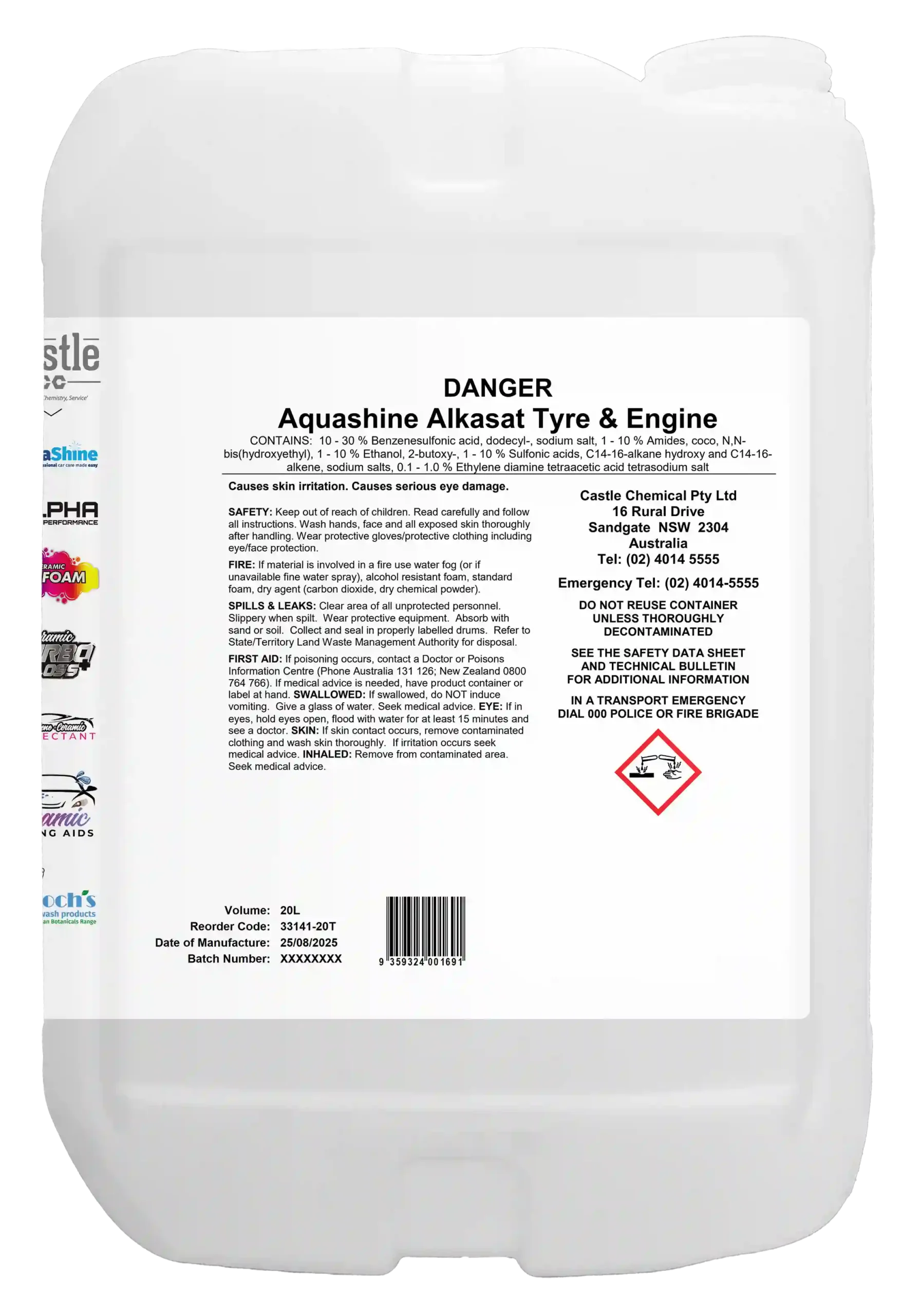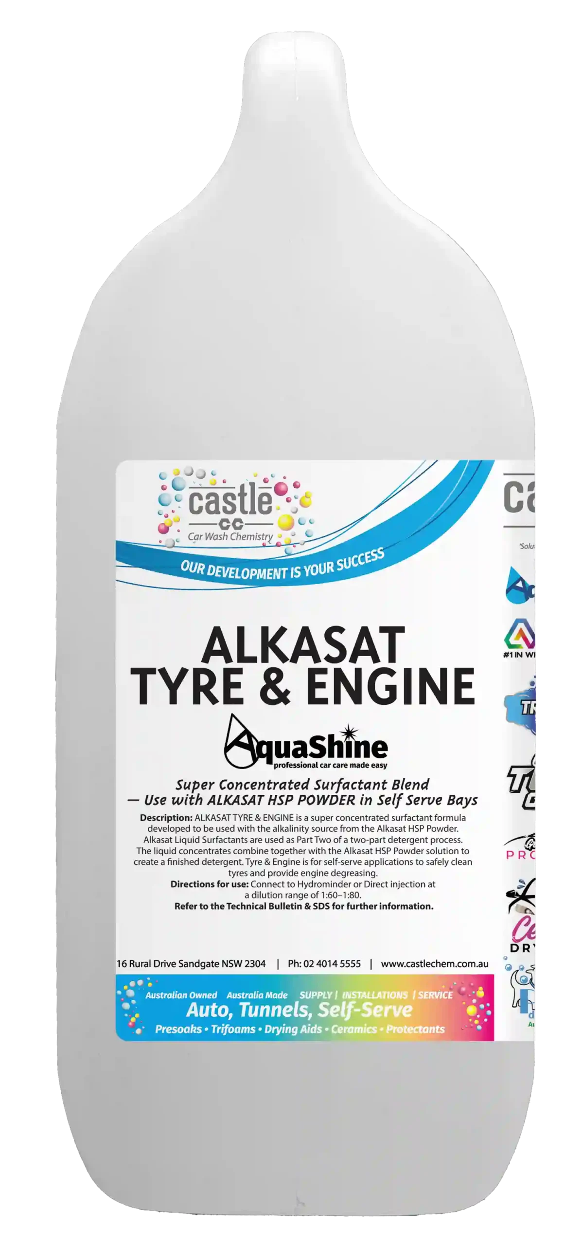 ALKASAT TYRE & ENGINE is a super concentrated surfactant formula developed to be used with the alkalinity source from the Alkasat HSP powder. Alkasat Liquid Surfactants are used as Part Two of a two-part detergent process. The liquid concentrates combine together with the Alkasat HSP Powder solution to create a finished detergent Tyre & Engine is for self-serve applications to safely clean tyres & provide engine degreasing.