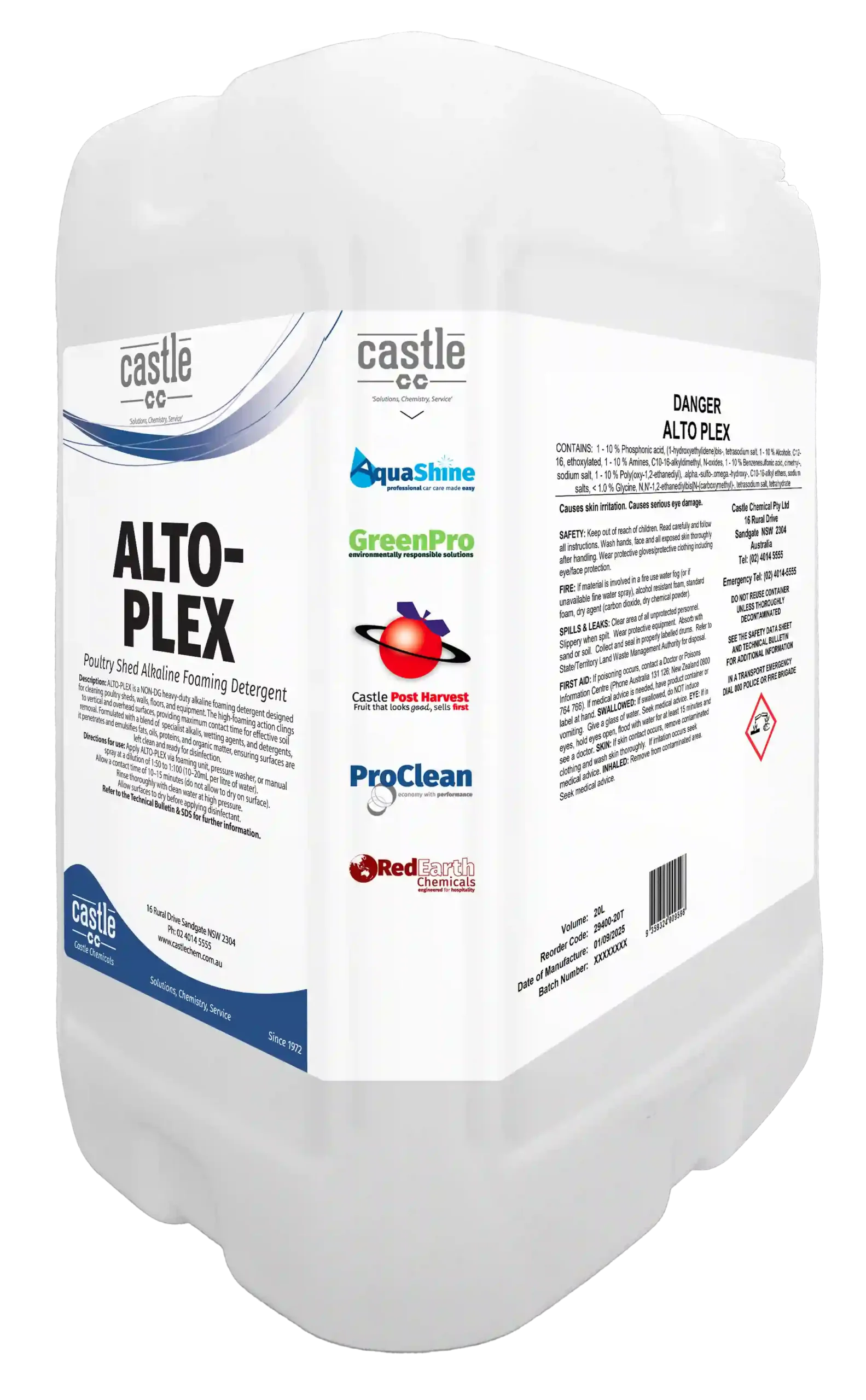 Alto-Plex is a NON-DG heavy-duty alkaline foaming detergent designed for cleaning poultry sheds, walls, floors and equipment.