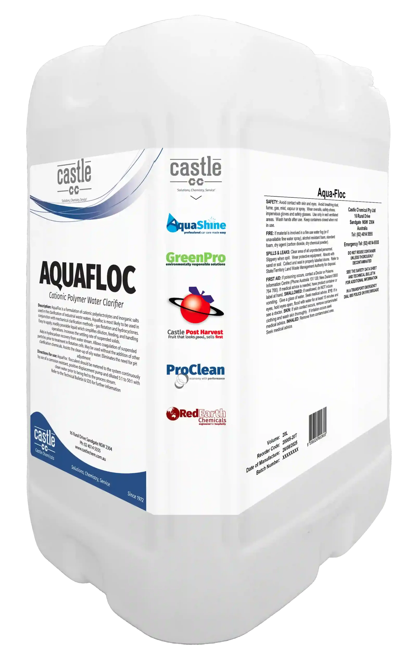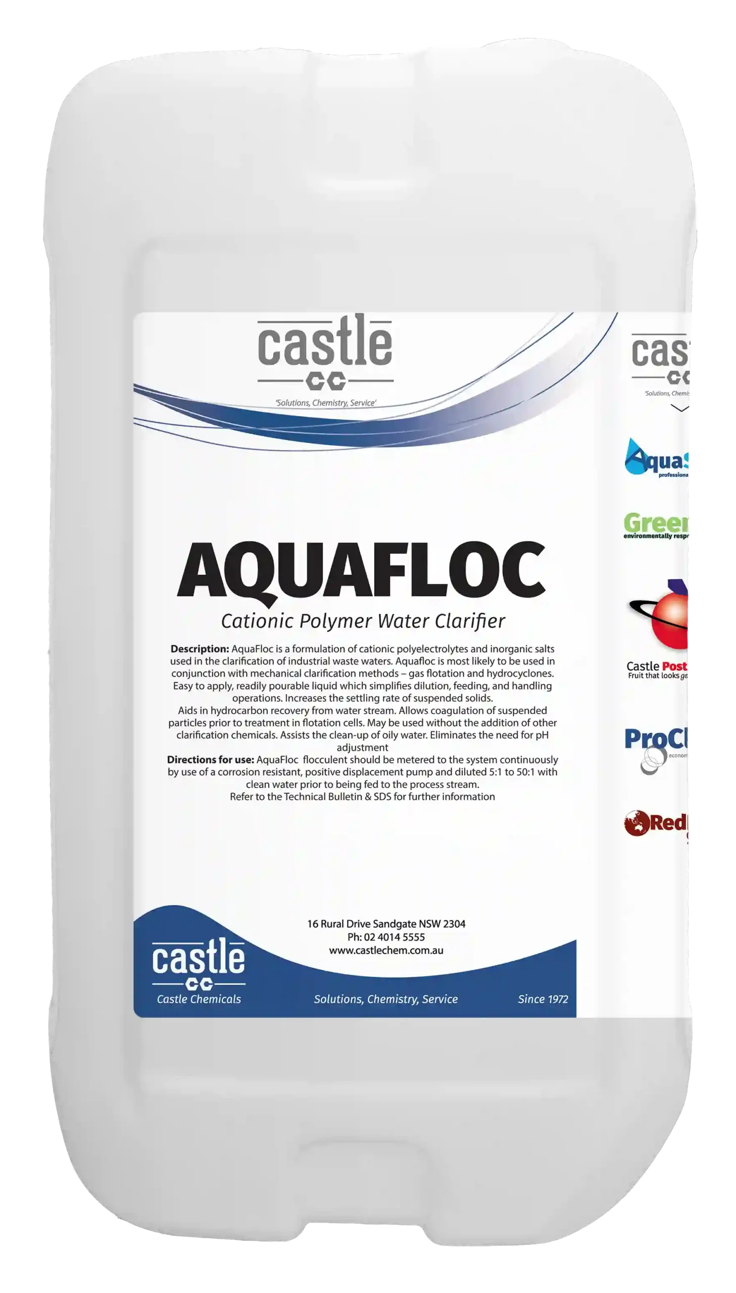 Aquafloc is a formulation of cationic polyelectrolytes and inorganic salts used in the clarification of industrial waste waters. Aquafloc is particularly useful for dynamic systems such as car wash water holding tanks and settlement systems.