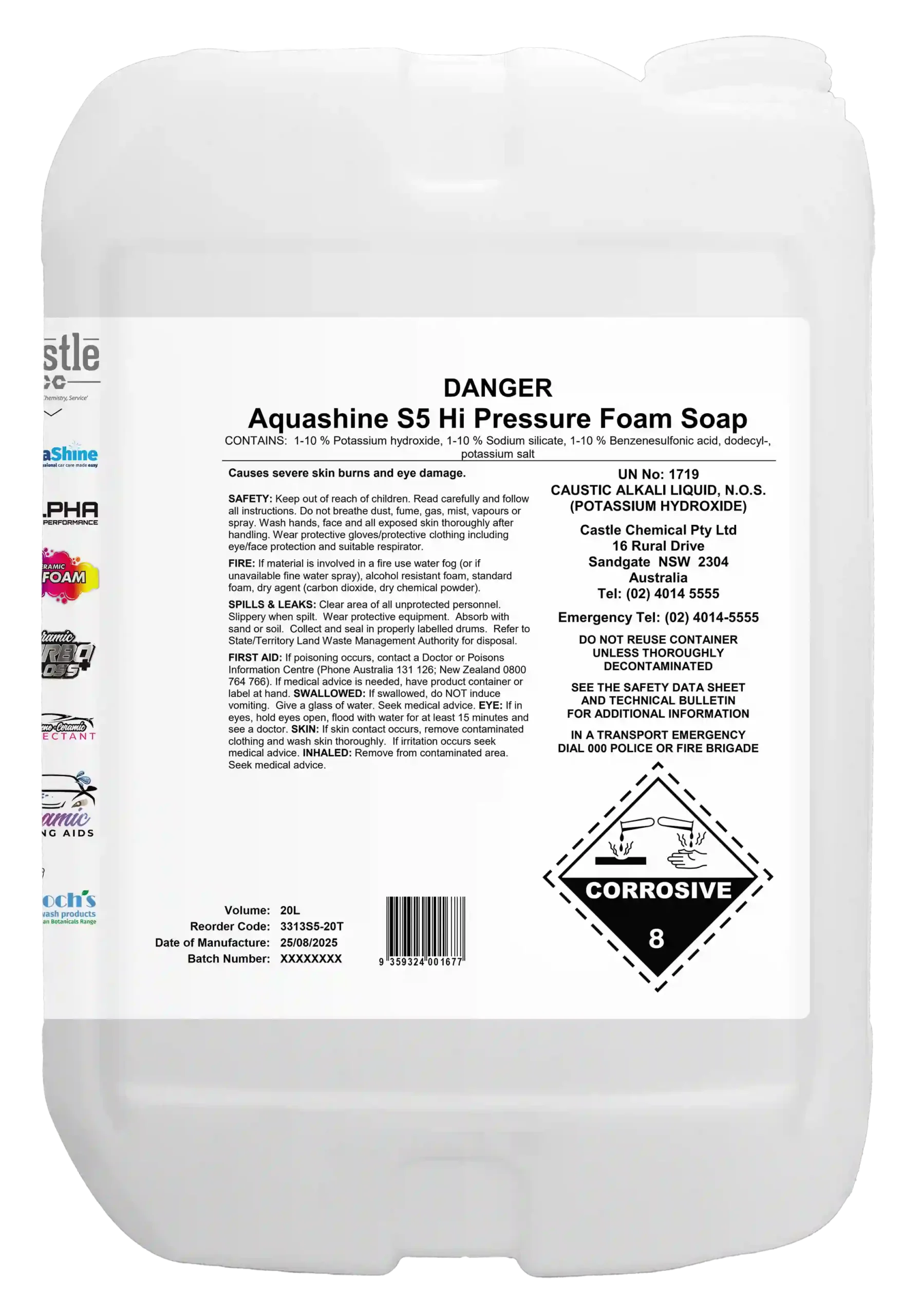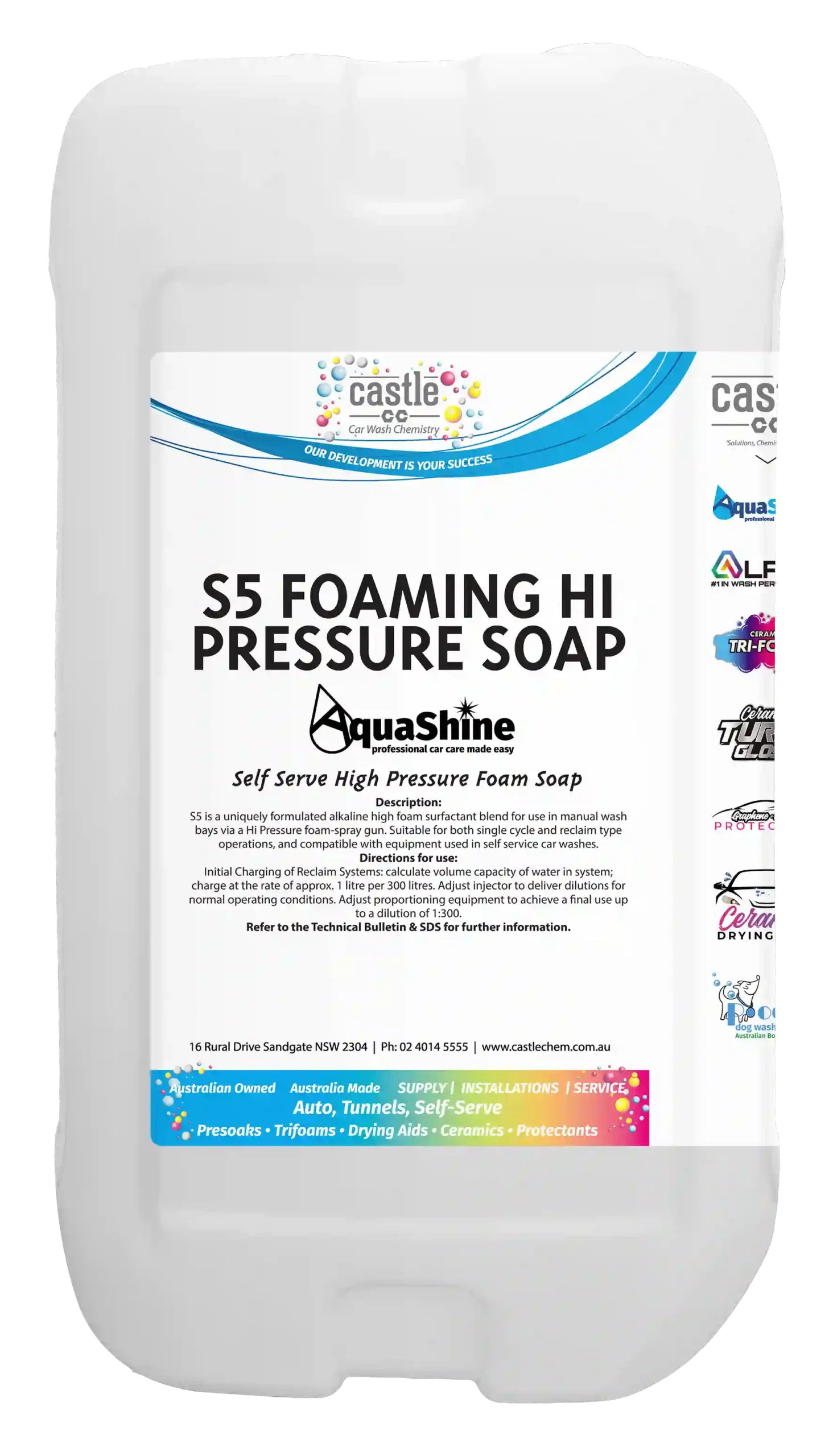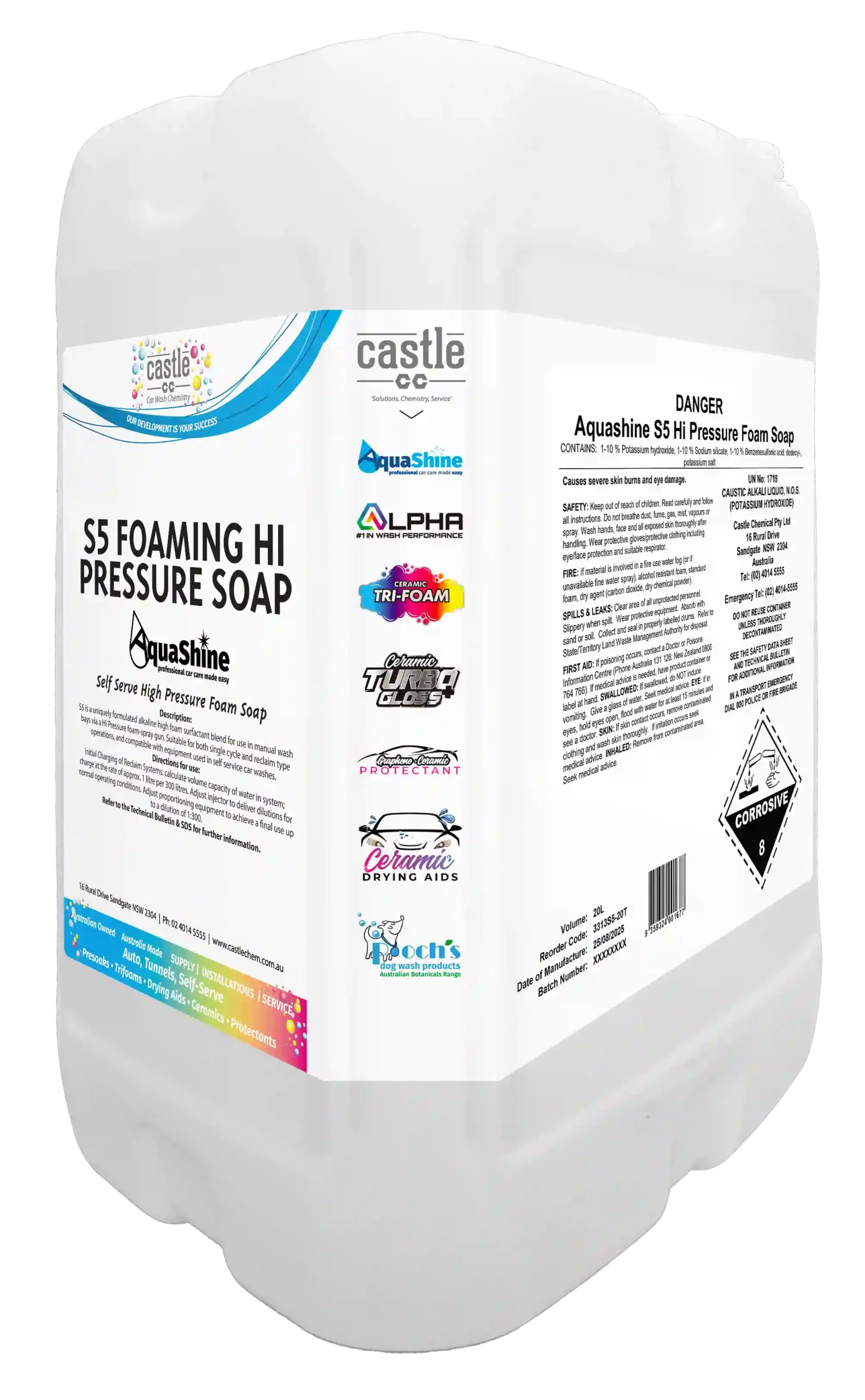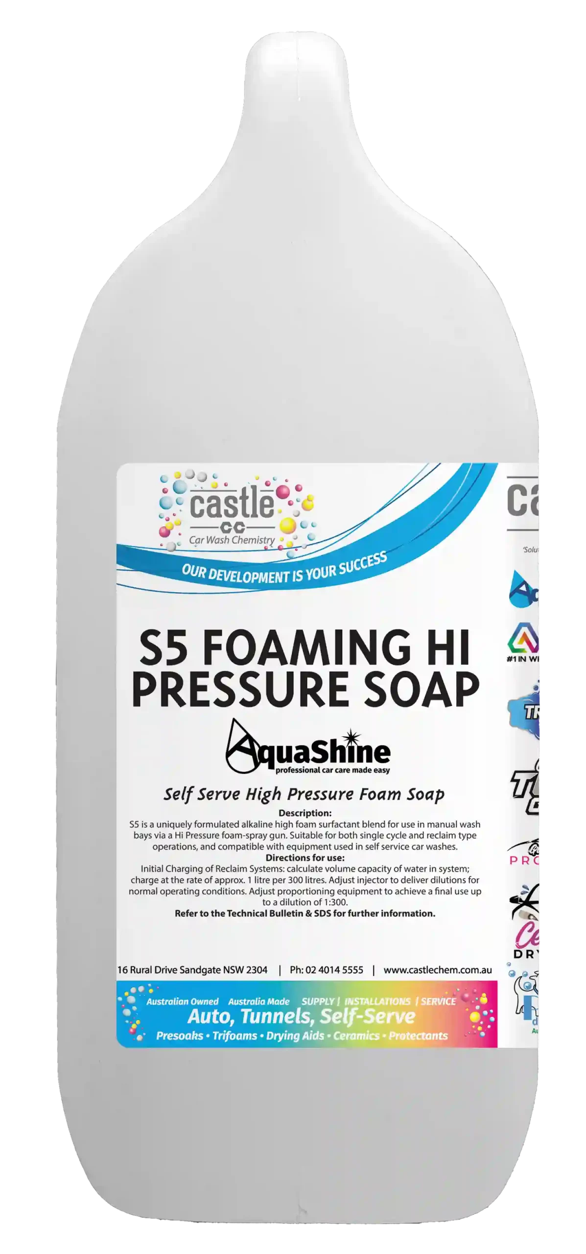 S5 is a robust alkaline foaming product developed for brushless manual vehicle washing using either hot or cold water. The combination of alkalis and solvents allows for rapid and thorough penetration of road soils, delivering effective cleaning performance when combined with water pressure. Unlike many pressure wash products, S5 does not rely solely on water pressure to achieve a high-quality clean.