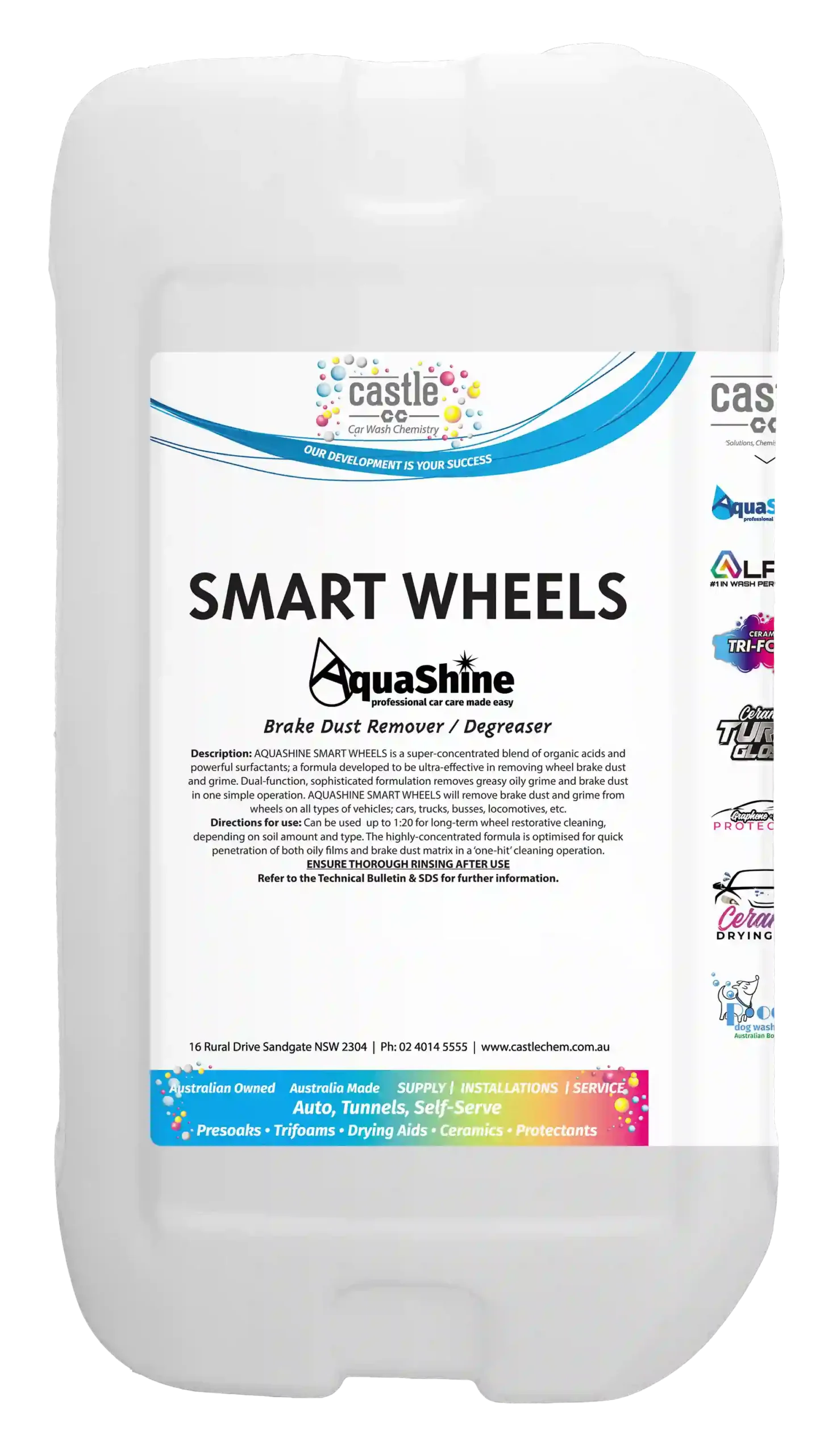 Aquashine Smart Wheels is designed to remove brake dust and grime from wheels on all types of vehicles, including cars, trucks, buses and locomotives.