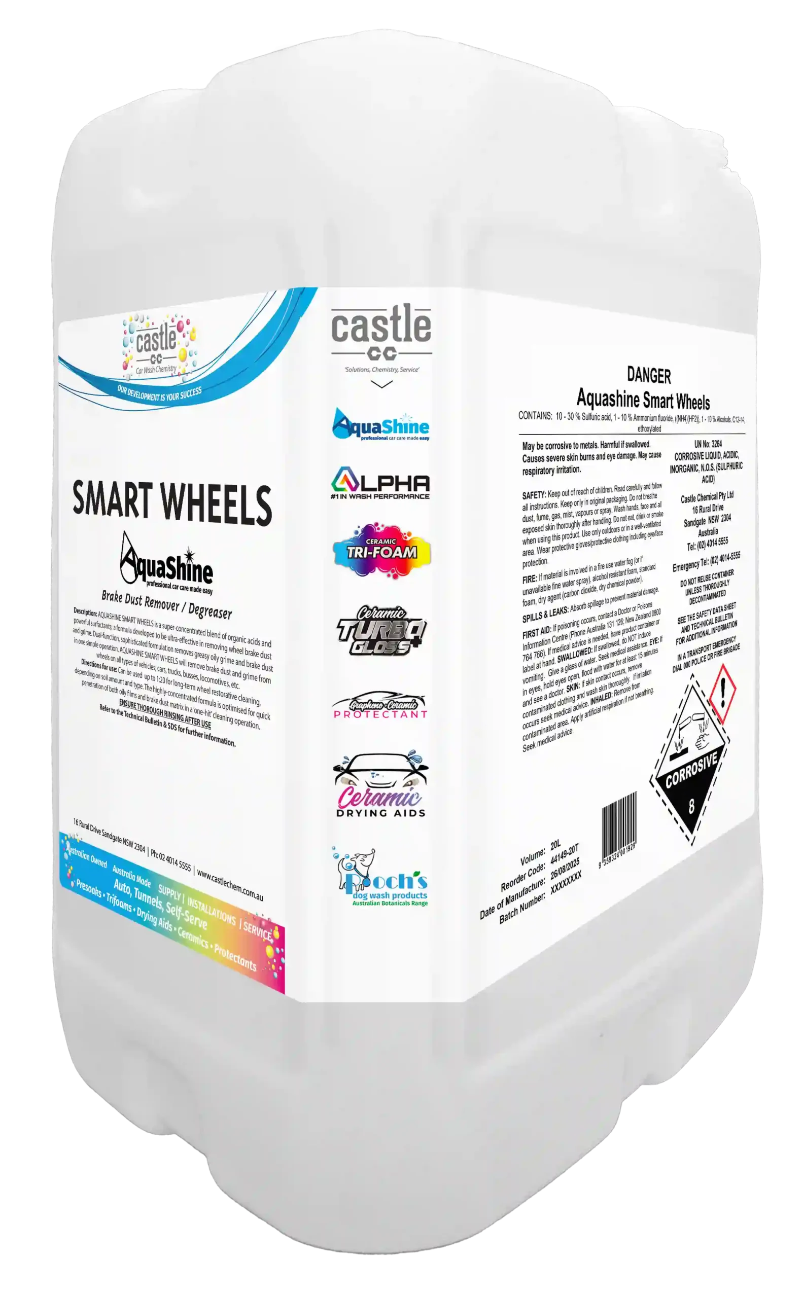 Aquashine Smart Wheels is a concentrated blend of organic salt acids and powerful surfactants designed to rapidly remove atmospheric corrosion, road grime and heavy soils from aluminium surfaces.