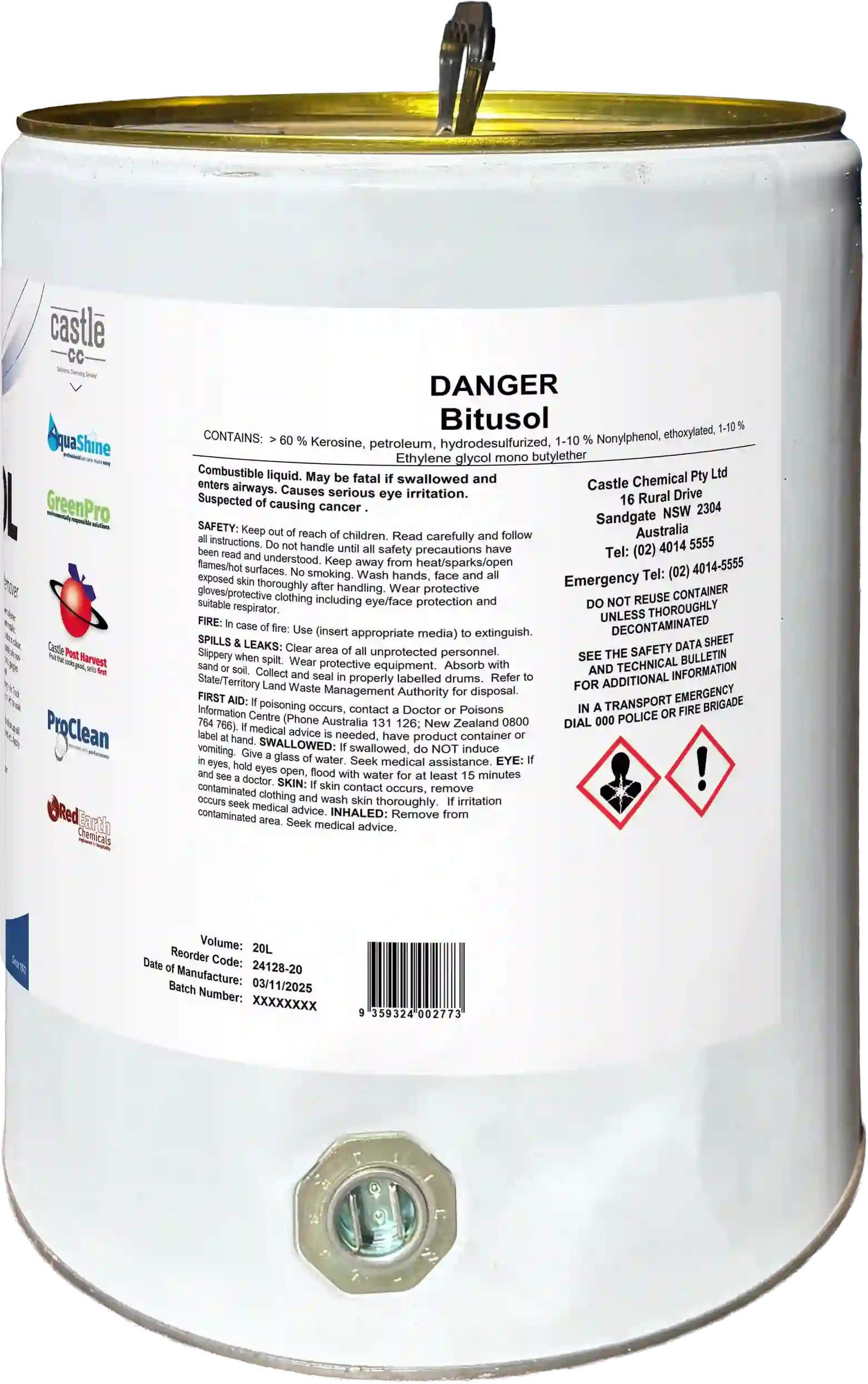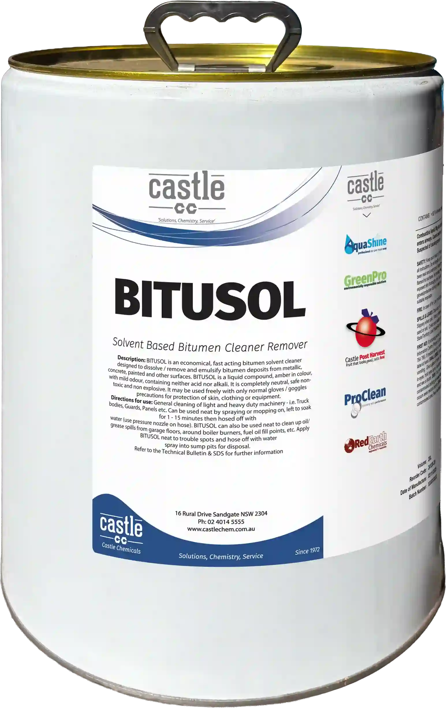 Castle Chemicals BITUSOL is an economical, fast acting bitumen solvent cleaner designed to dissolve / remove and emulsify bitumen deposits from metallic, concrete, painted and other surfaces.