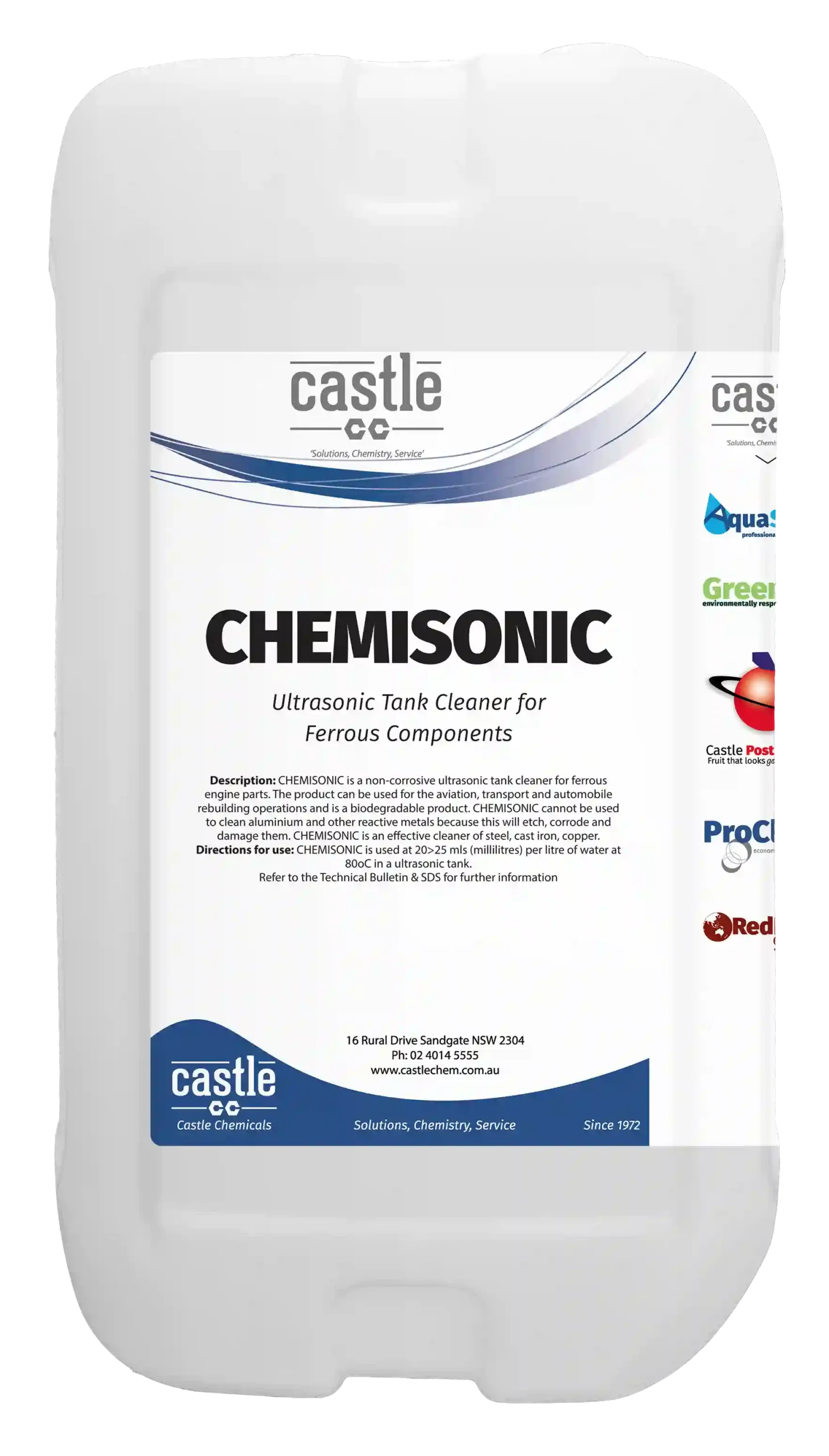 CHEMISONIC is a non-corrosive ultrasonic tank cleaner for ferrous engine parts. The product can be used for the aviation, transport and automobile rebuilding operations and is a biodegradable product.