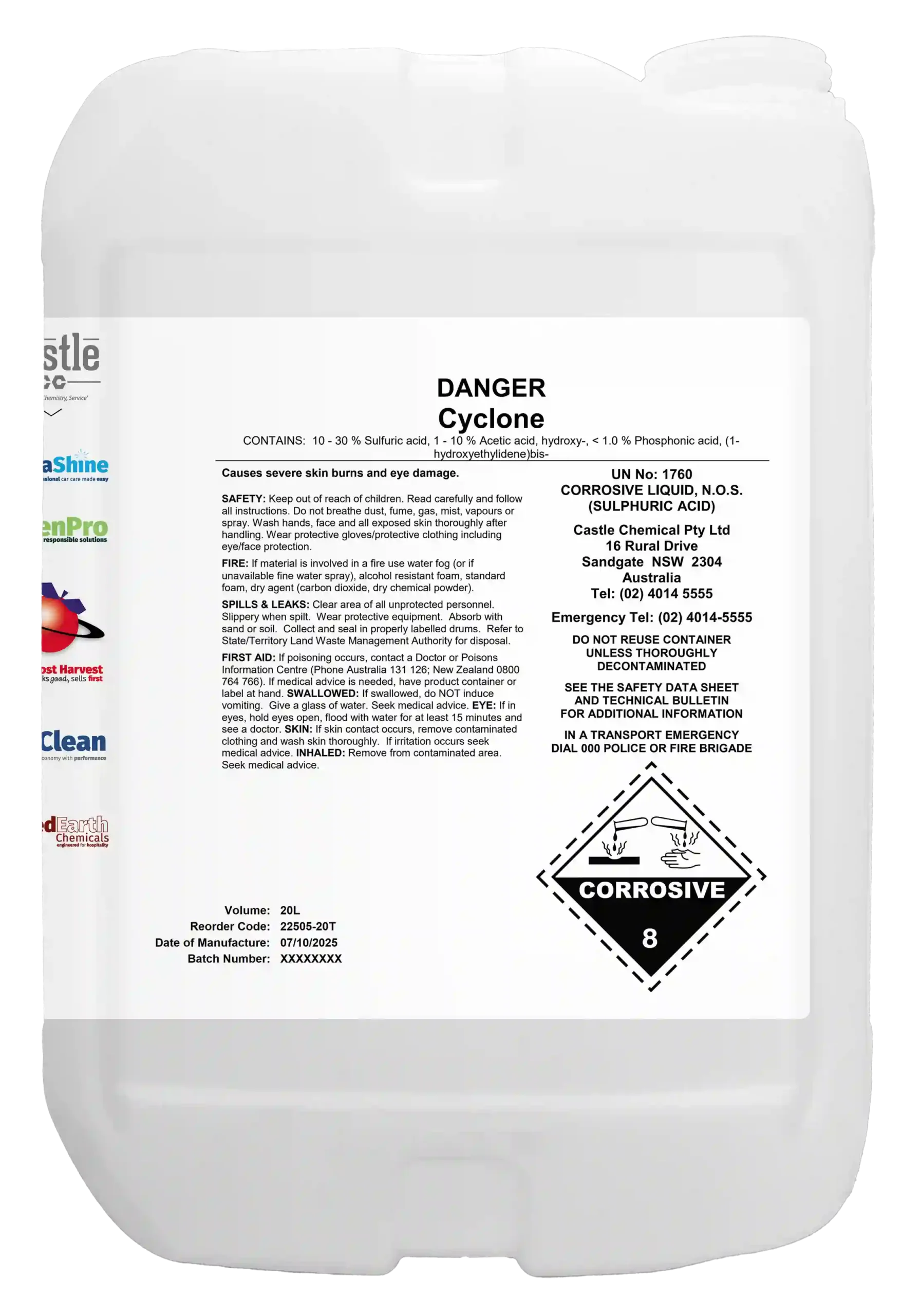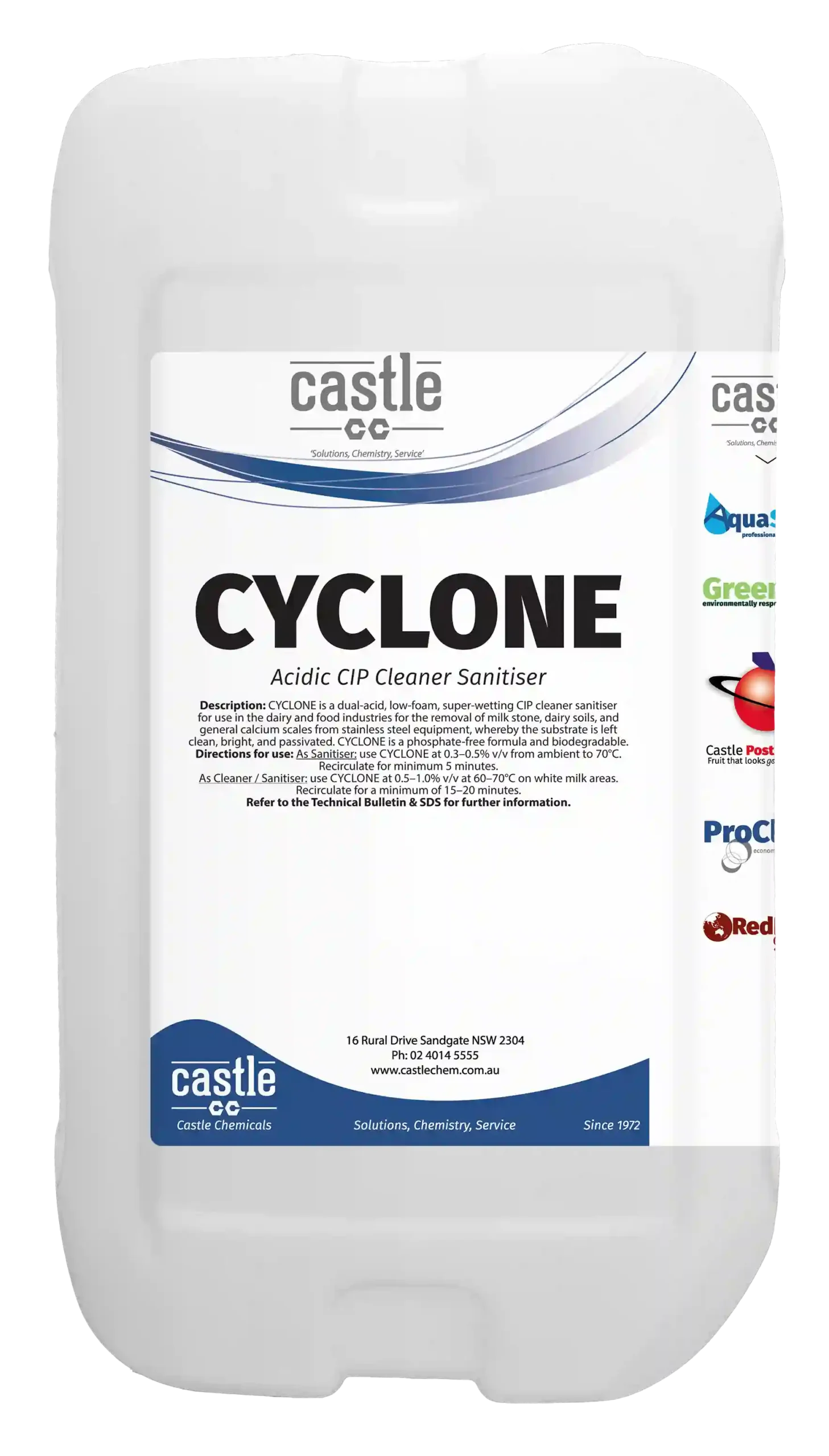 Cyclone is an acidic low foaming, phosphate free sanitiser for use in the dairy and food industries for the removal of milkstone, dairy soils and general calcium scales from stainless steel equipment, whereby the substrate is left clean, bright and passivated.