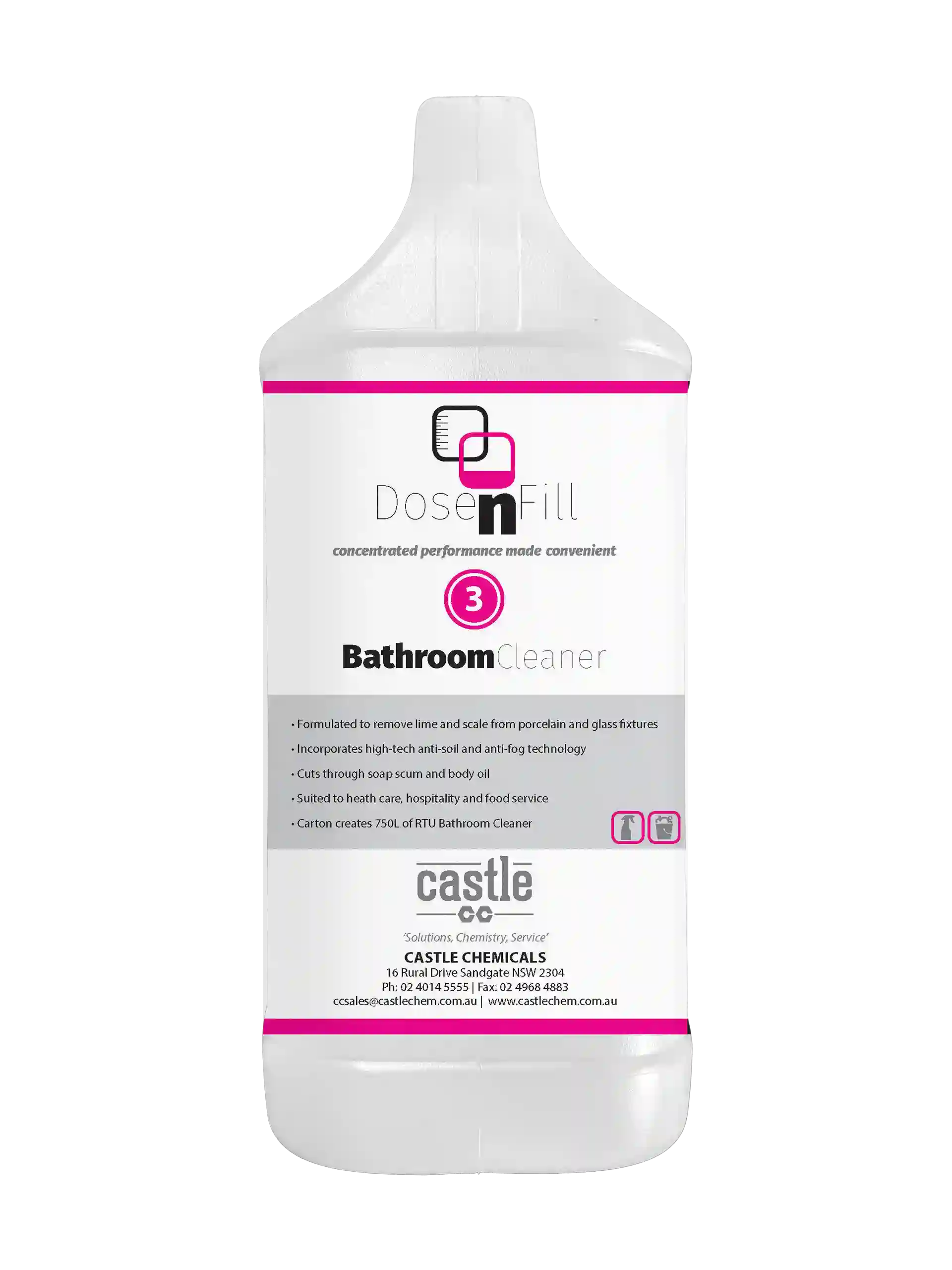 Removes lime & scale, cuts through oil, body fats and soap scum. Contains high-tech anti-soil and anti-fog properties. Dilution ratio 1:75 (10mL per 750mL bottle or 135mL per 10L bucket)