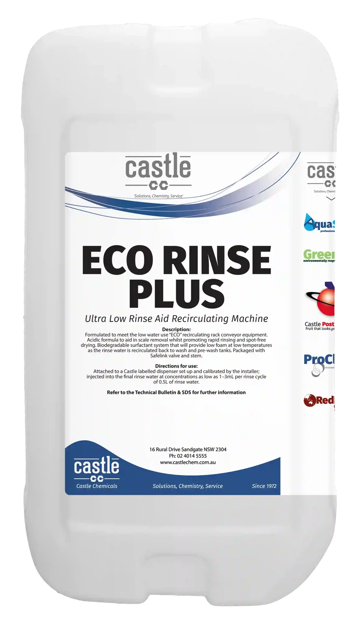 ECO RINSE PLUS is a Ultra Low Foam super wetting agent, which enables glassware, dishes and utensils to dry thoroughly and quickly without spotting or streaking.