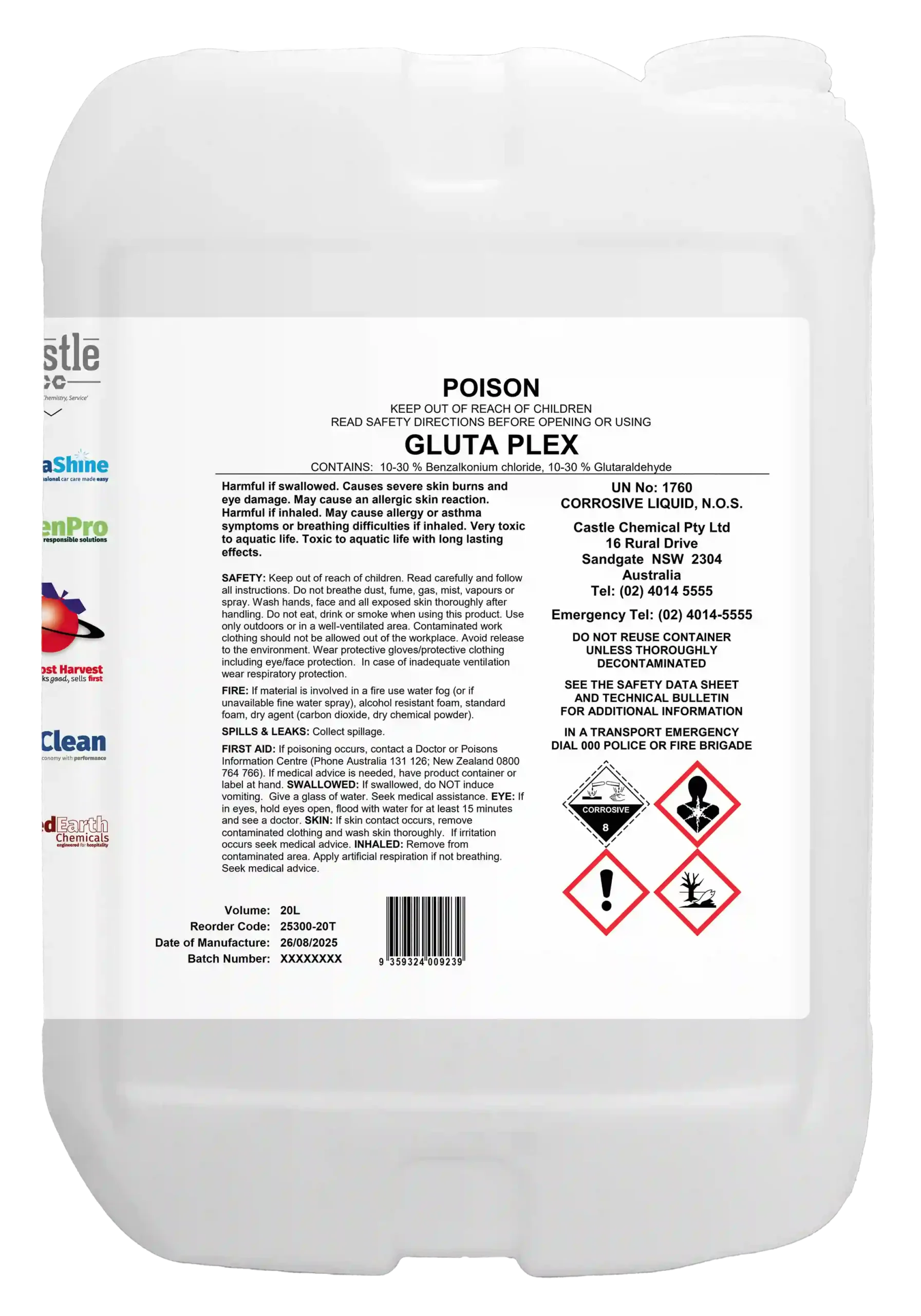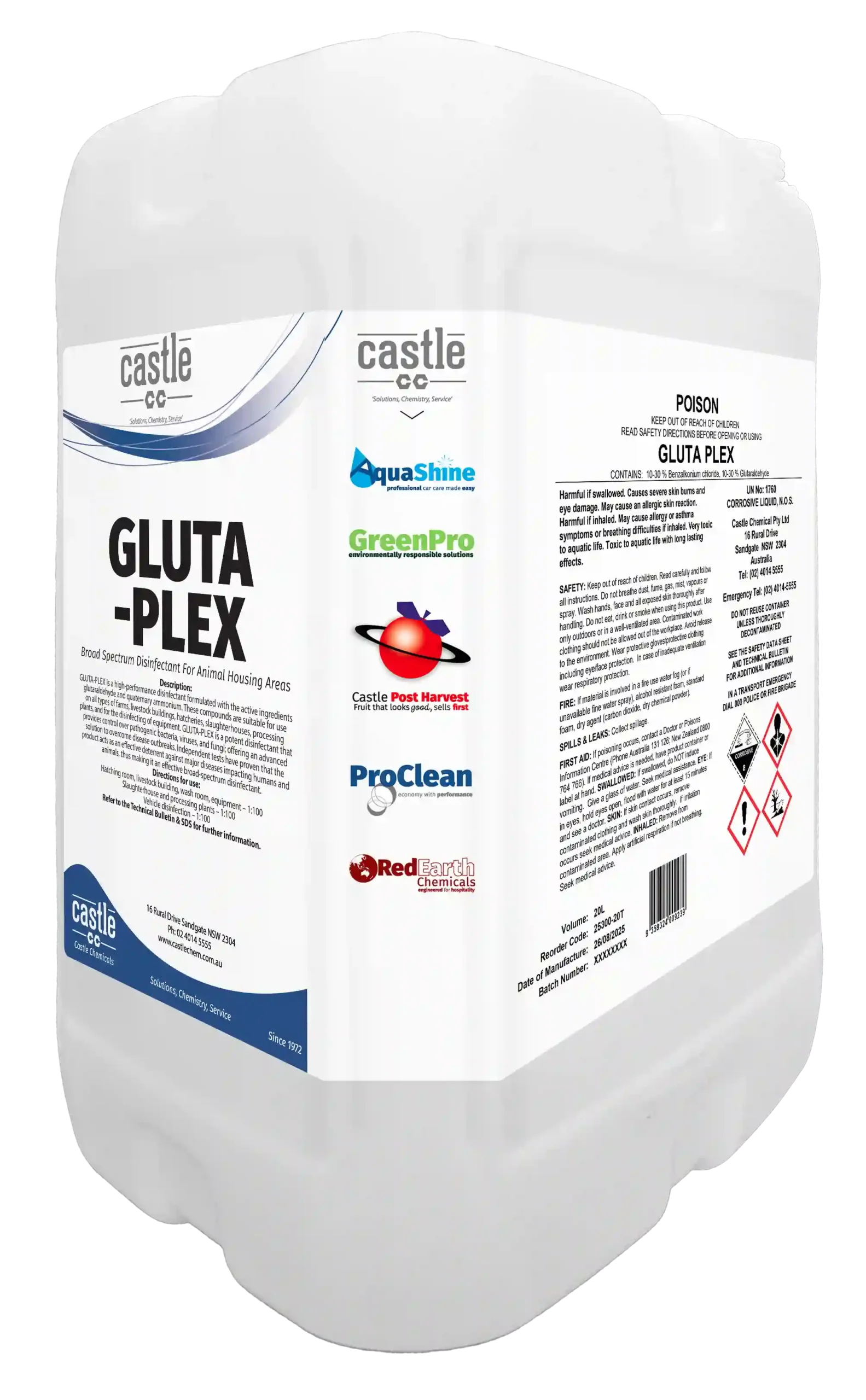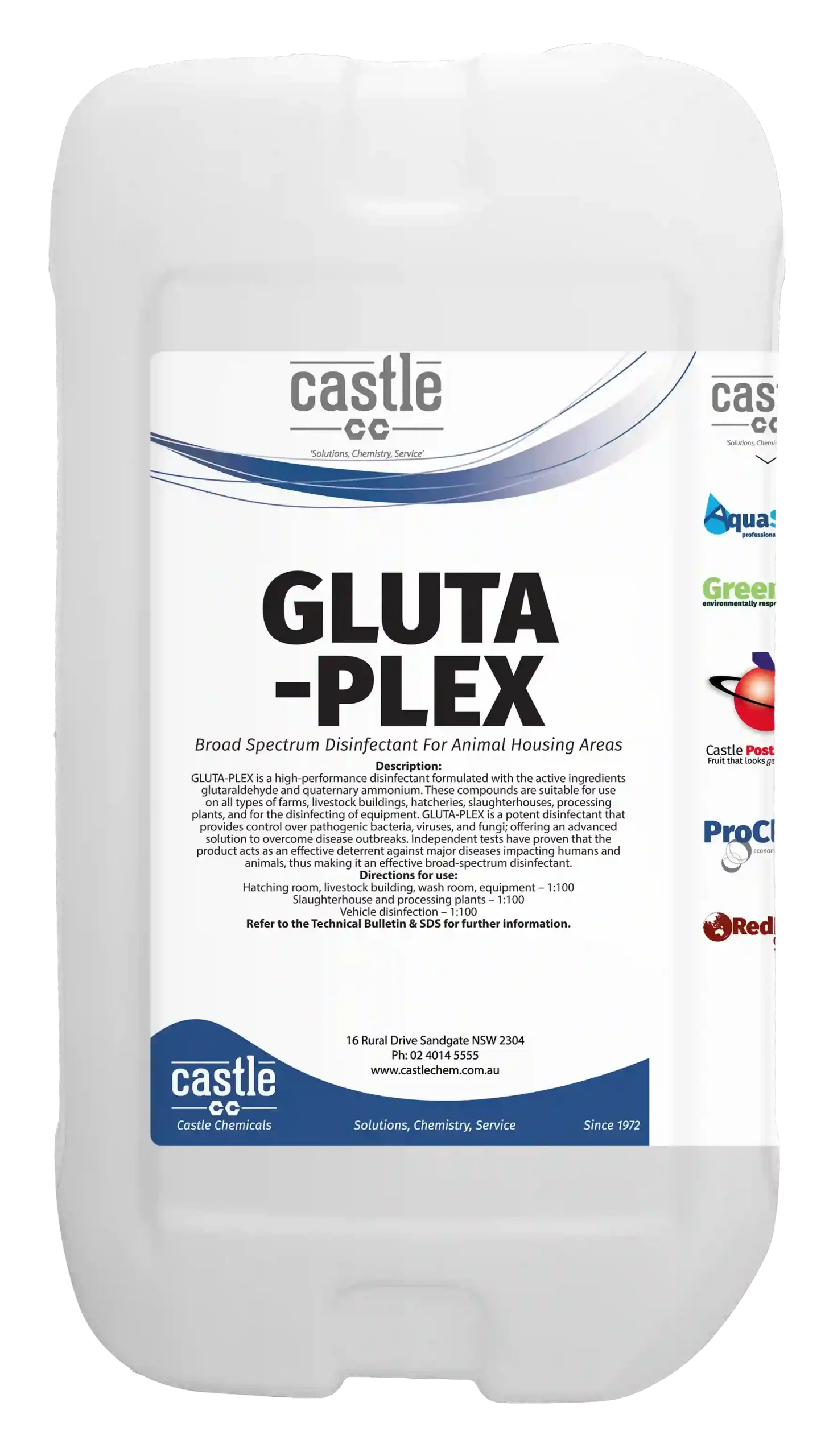 Gluta-Plex is a high performance disinfectant formulated with the active ingredients gluteraldehyde and quaternary ammonium. These compounds are suitable for use on all types of farms, livestock buildings, hatcheries, slaughterhouses, processing plants and for the disinfecting of equipment.