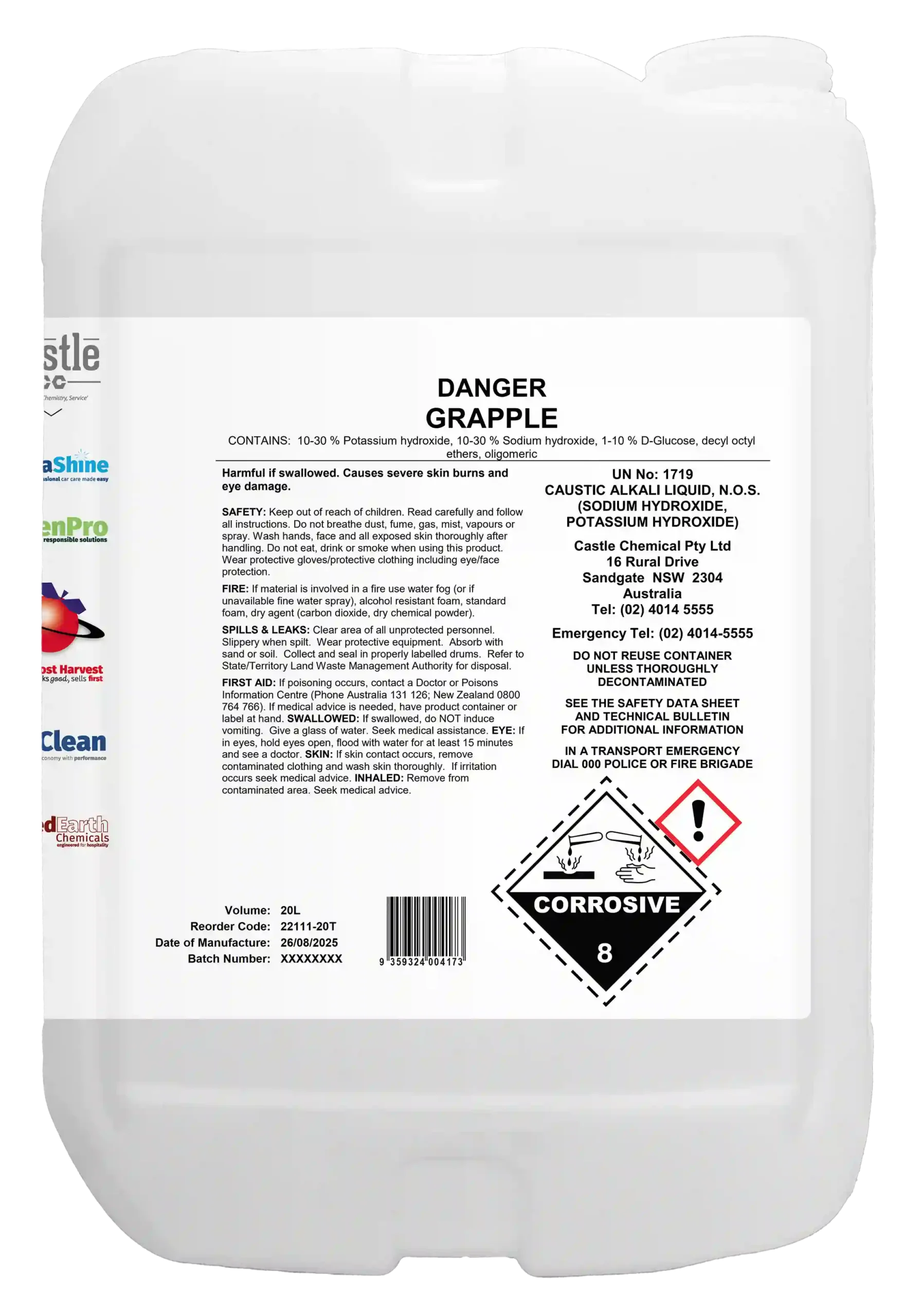 GRAPPLE is a technologically advanced liquid formula for the cleaning-degreasing of meat rollers, slides and gambrels in abattoir & meat establishments. GRAPPLE is a dual hydroxide system combined with a highly specialised super wetting agent, sequestrants, water softeners, and low foam surfactants. Animal fat, grease, and rust are removed by the simple hot tank process.