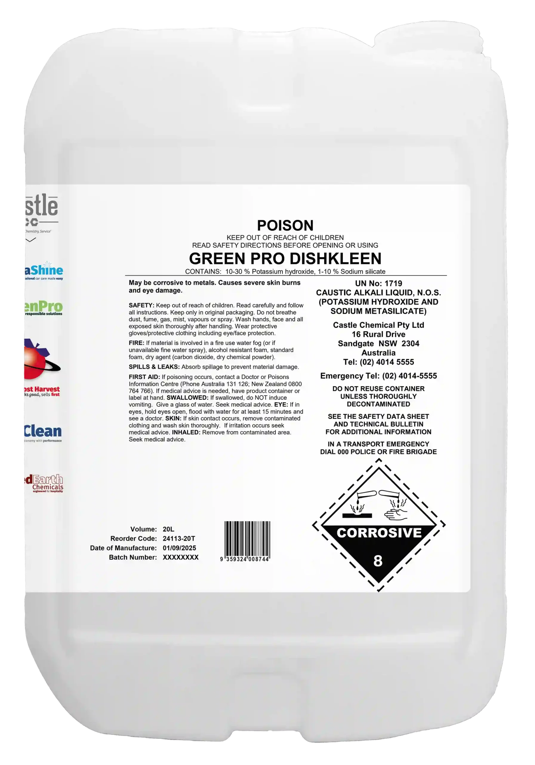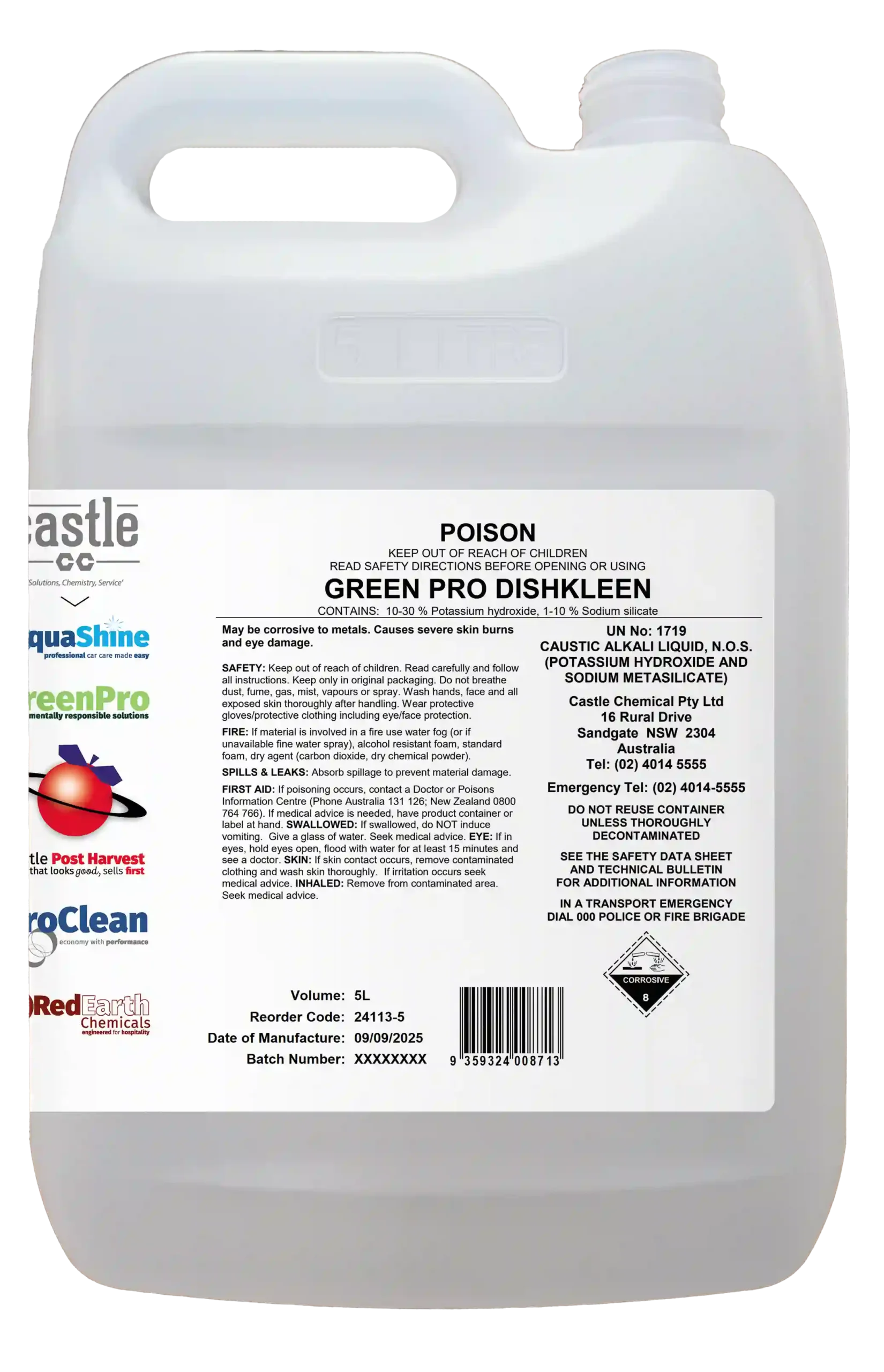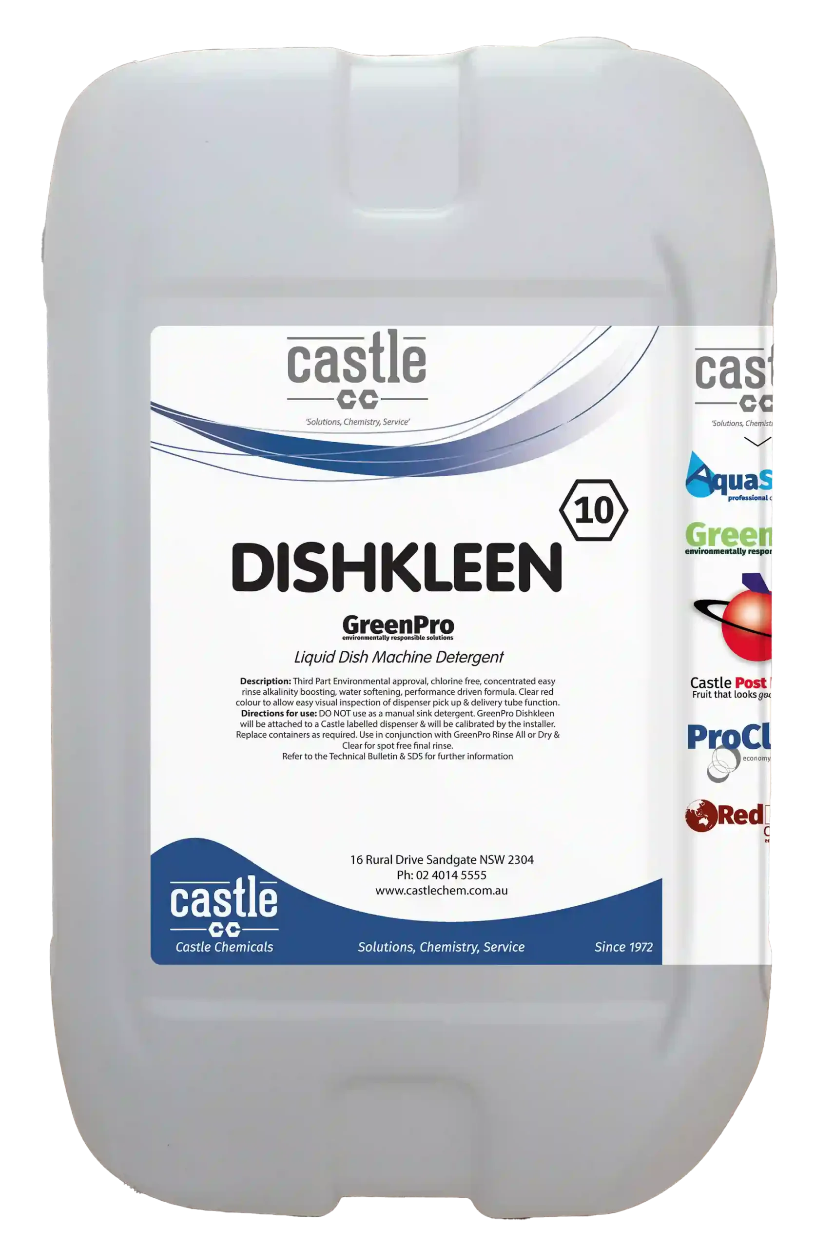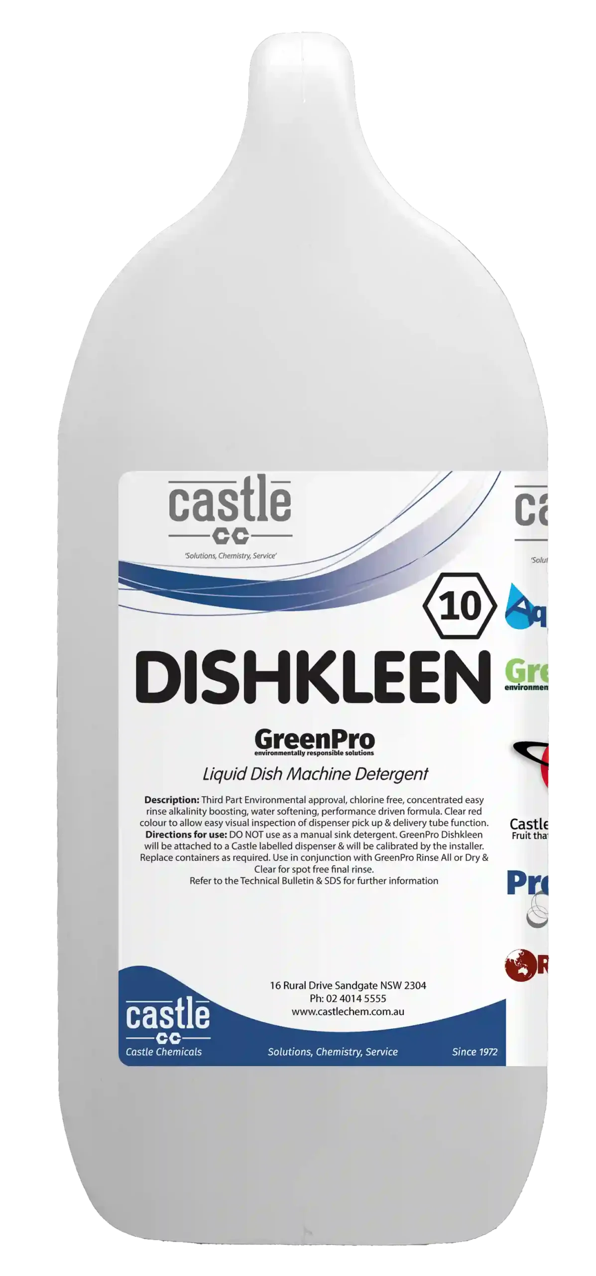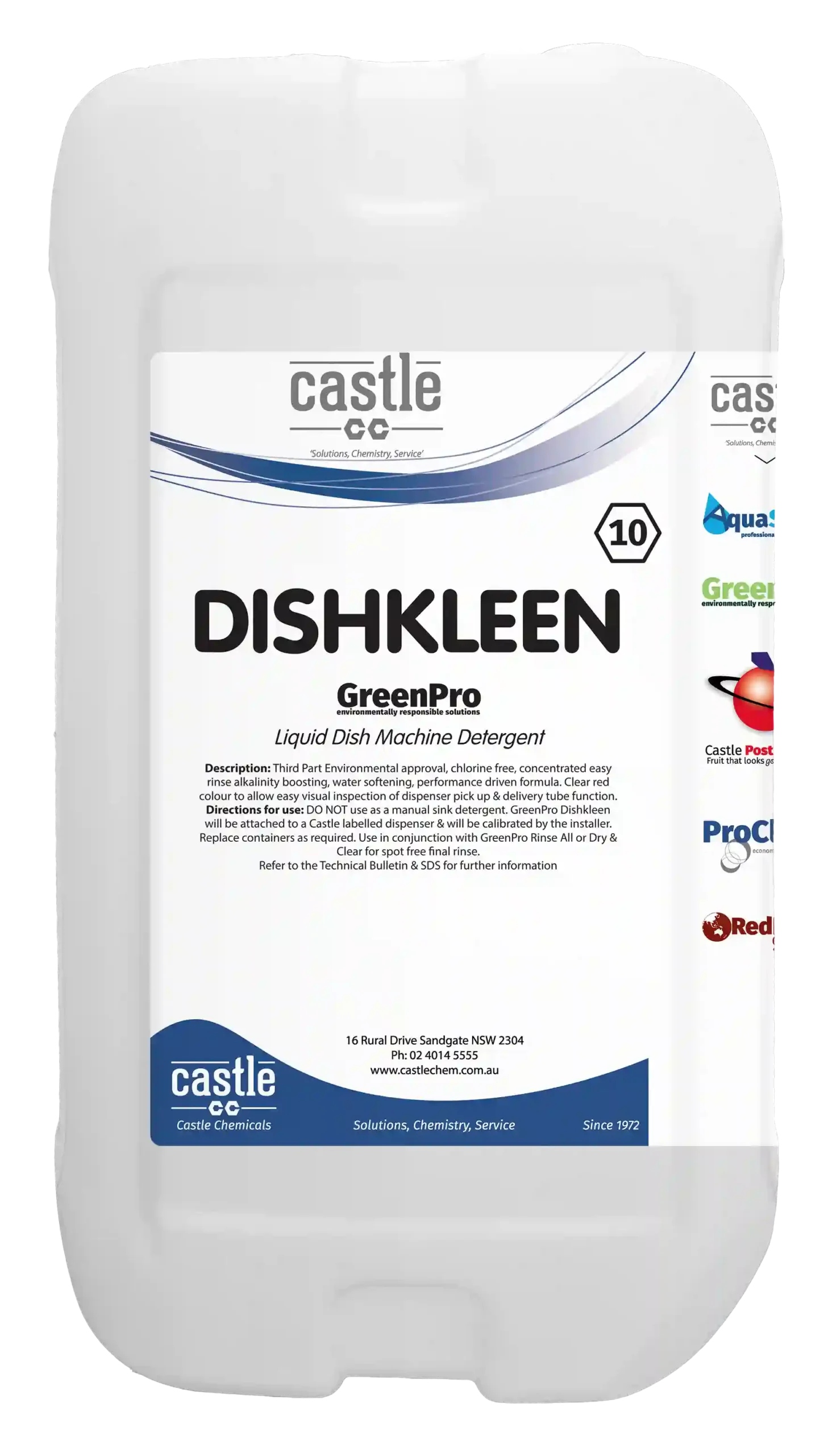 GREEN-PRO DISHKLEEN represents one of the new generation of Castle ‘Green Pro’ range of products. It is a pale red, odourless, very alkaline liquid. It is a carefully balanced blend of low foaming cleansers, alkalis, and water softening agents and is readily miscible with water.