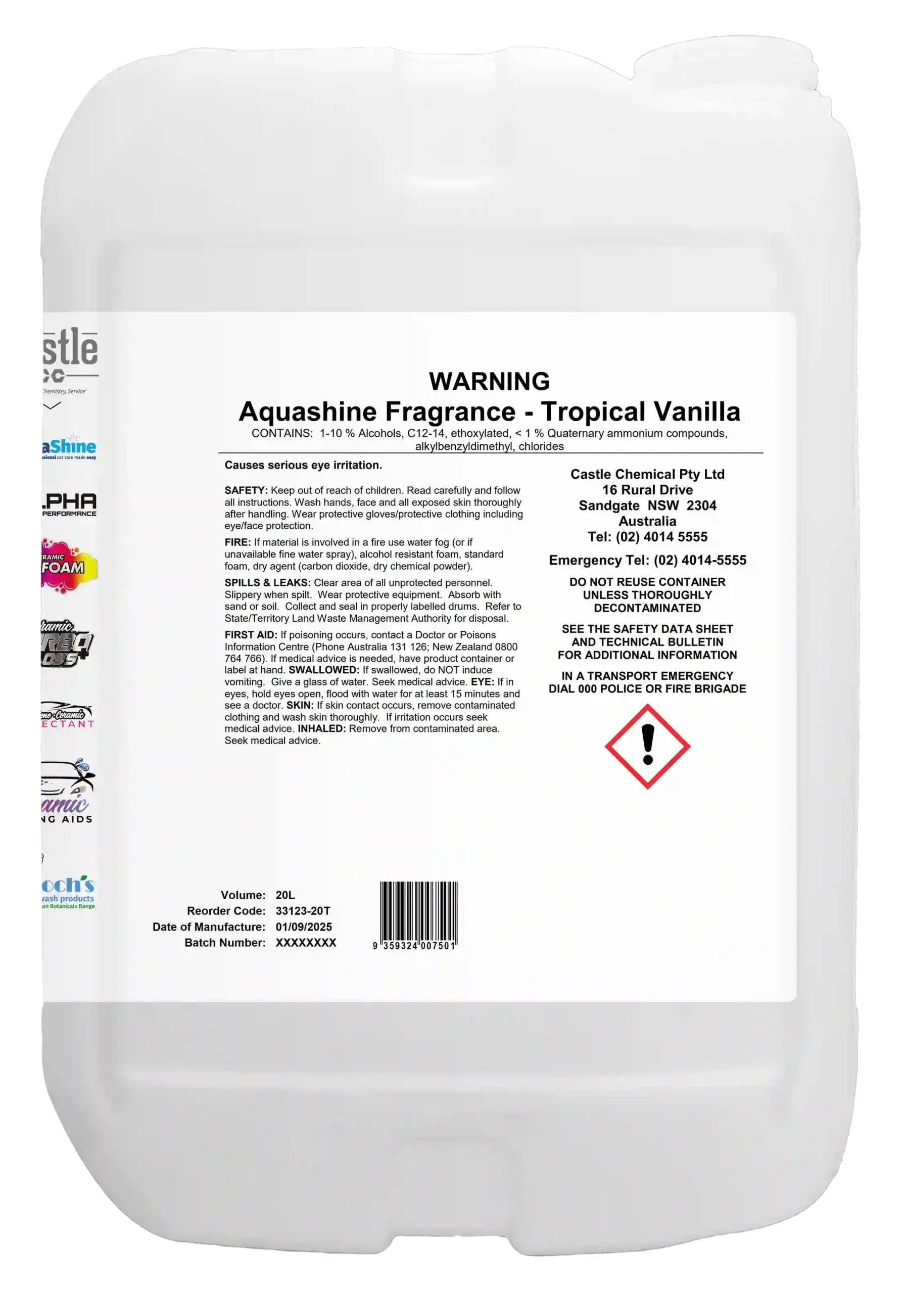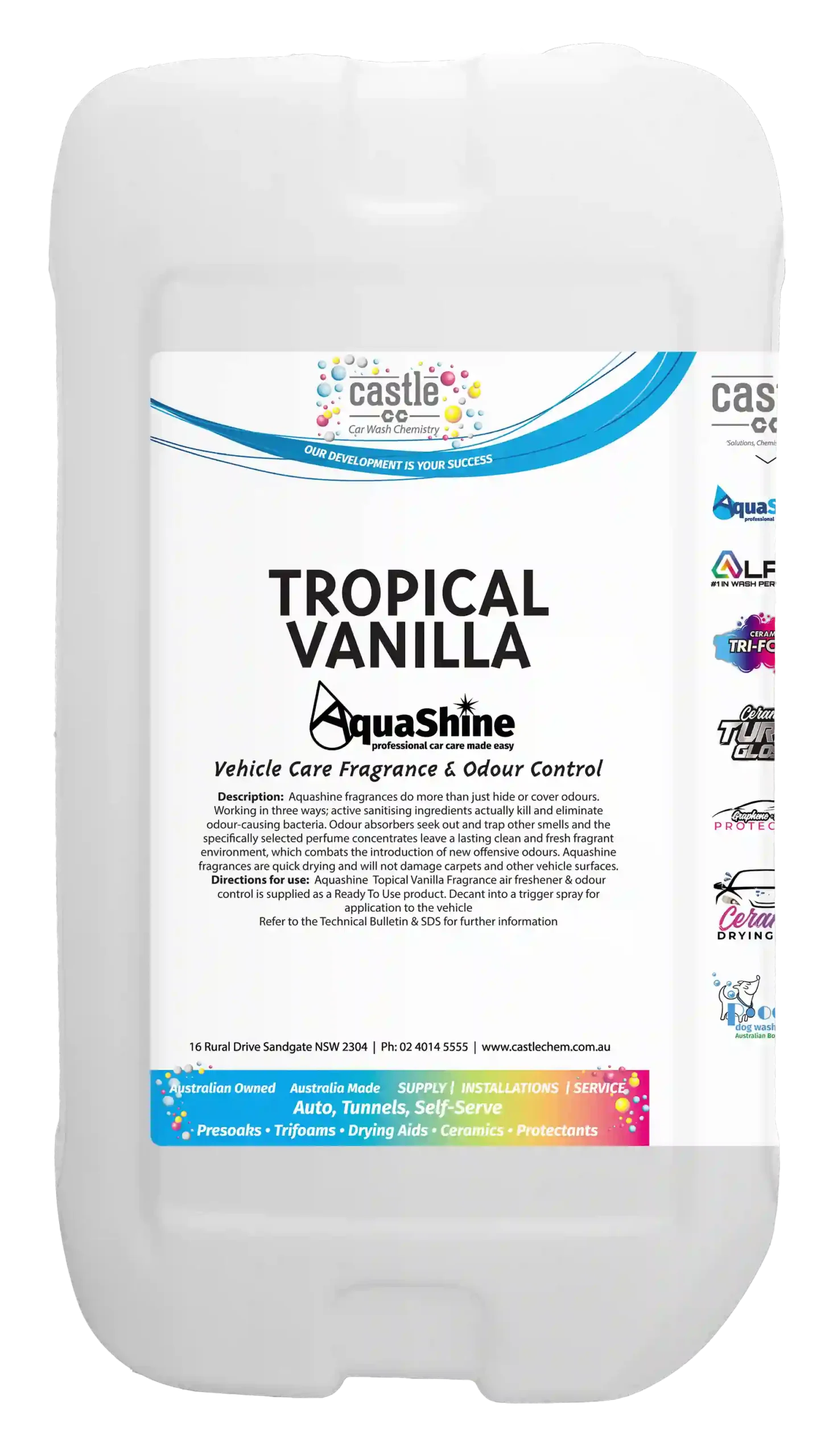 Aquashine Car Wash Fragrances are a premium range of triple action automotive air fresheners designed to deliver a long-lasting, clean and pleasant fragrance experience. The range is suitable for a wide variety of car wash and vehicle interior applications and is diluted at a ratio of one part product to twenty parts water.