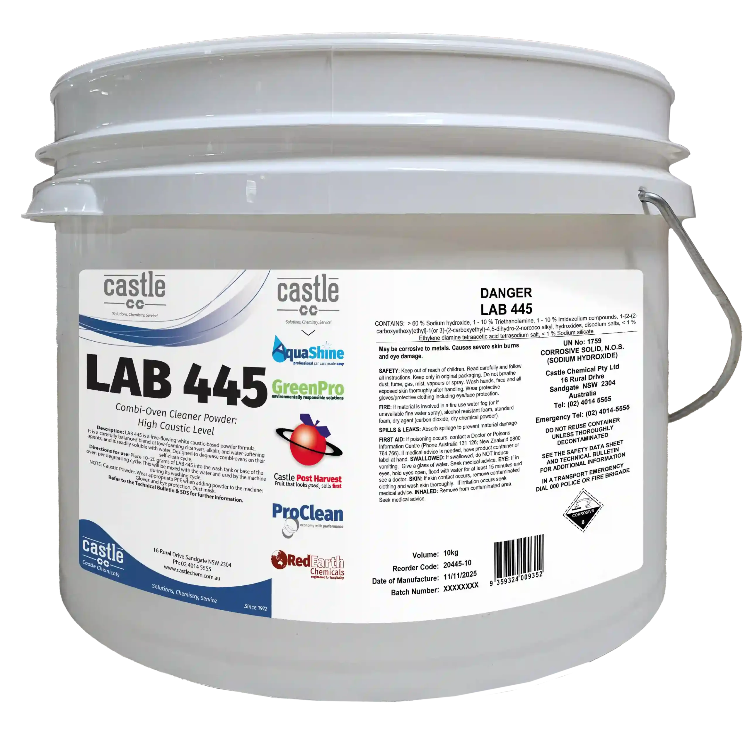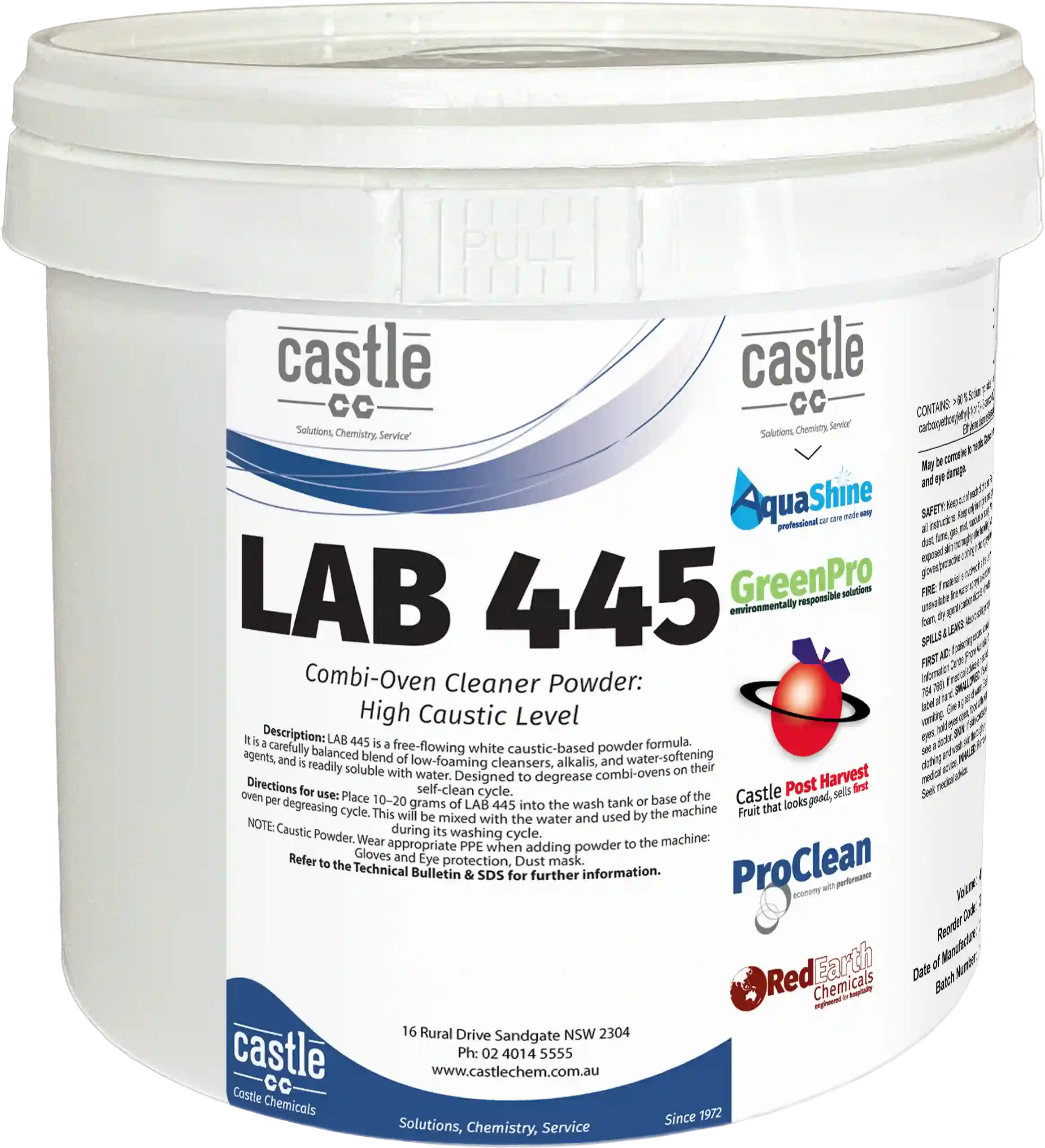 Lab 445 is a free-flowing white caustic-based powder formula. It is a carefully balanced blend of low-foaming cleansers, alkalis and water-softening agents and is readily soluble with water. Designed to de-grease combi-ovens on their self-clean cycle.