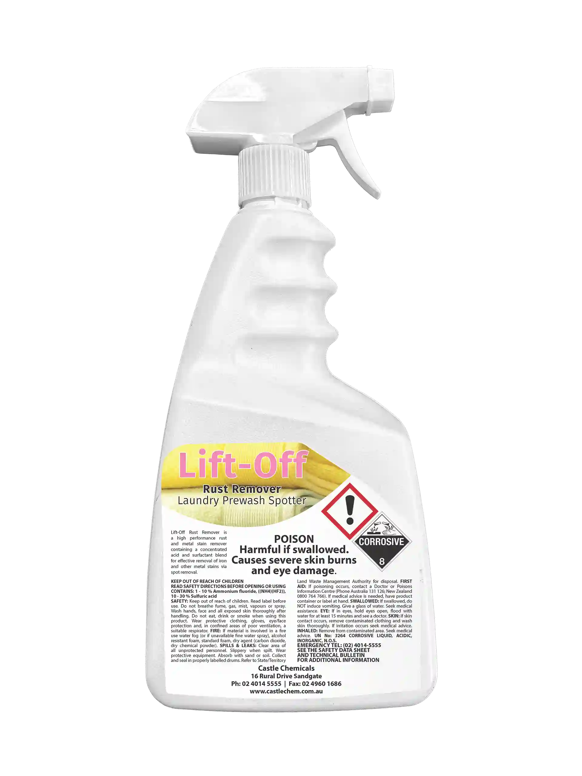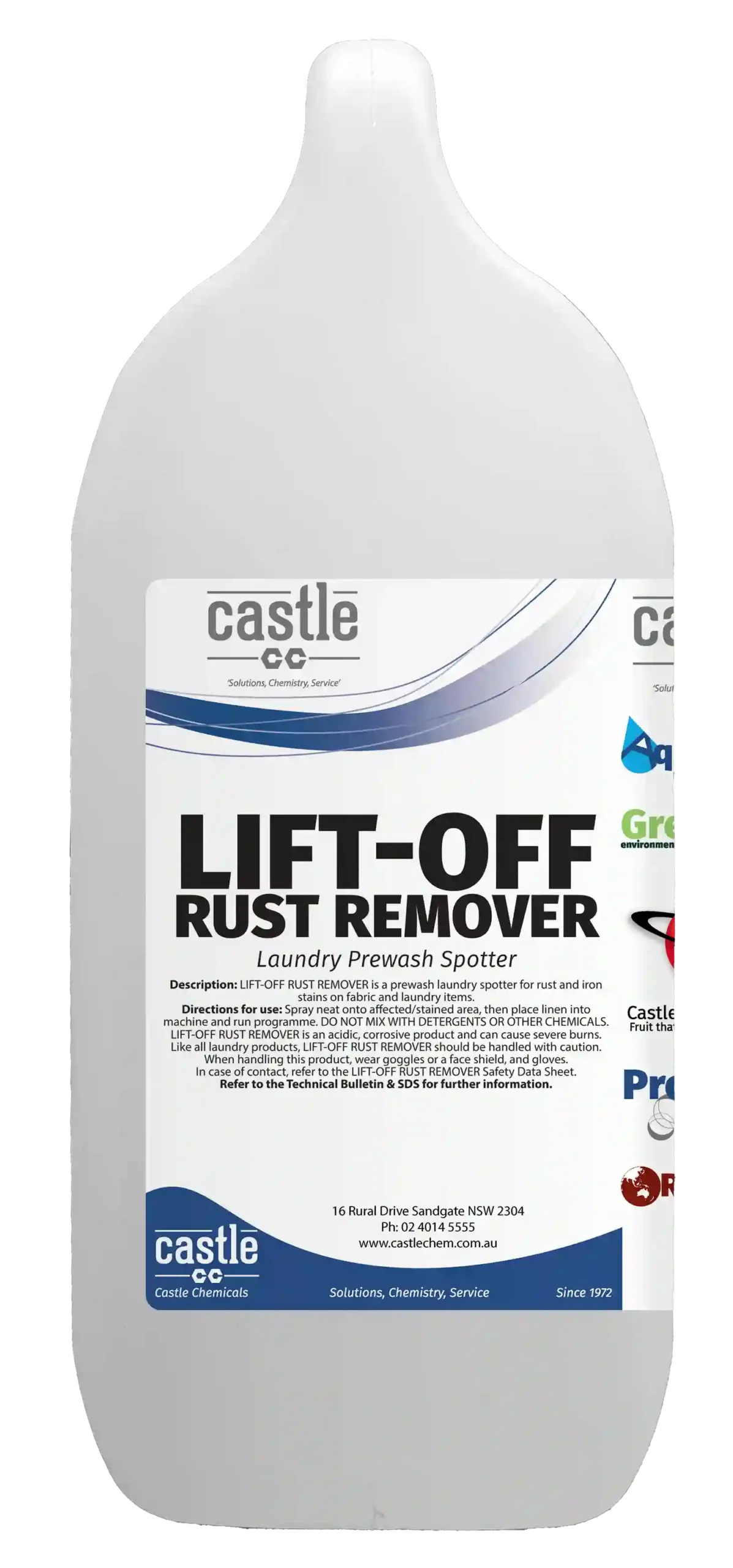LIFT-OFF RUST REMOVER is a high performance rust and metal stain remover. LIFT-OFF can be used as a prewash spotter to help remove stains caused by iron and other metals.