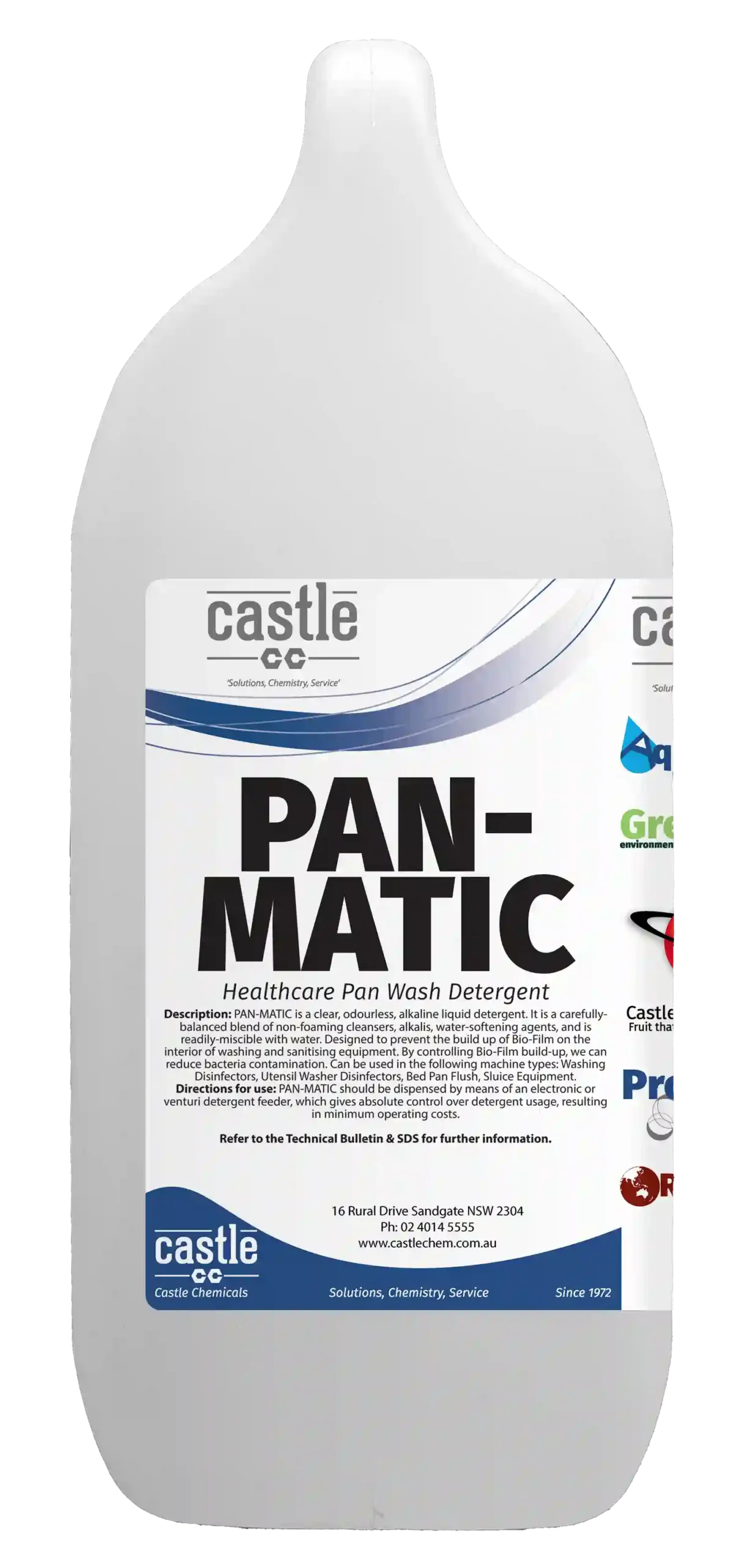 PAN-MATIC is a clear, odourless, alkaline liquid detergent. It is a carefully-balanced blend of non-foaming cleansers, alkalis, water-softening agents, and is readily-miscible with water. Designed to prevent the build up of Bio-Film on the interior of washing and sanitising equipment.